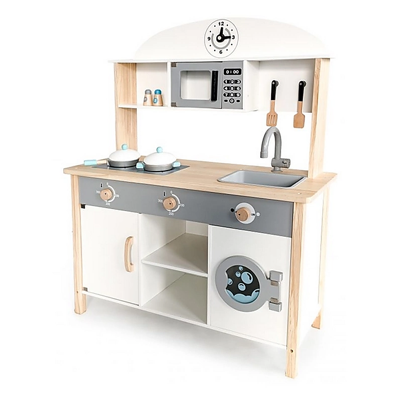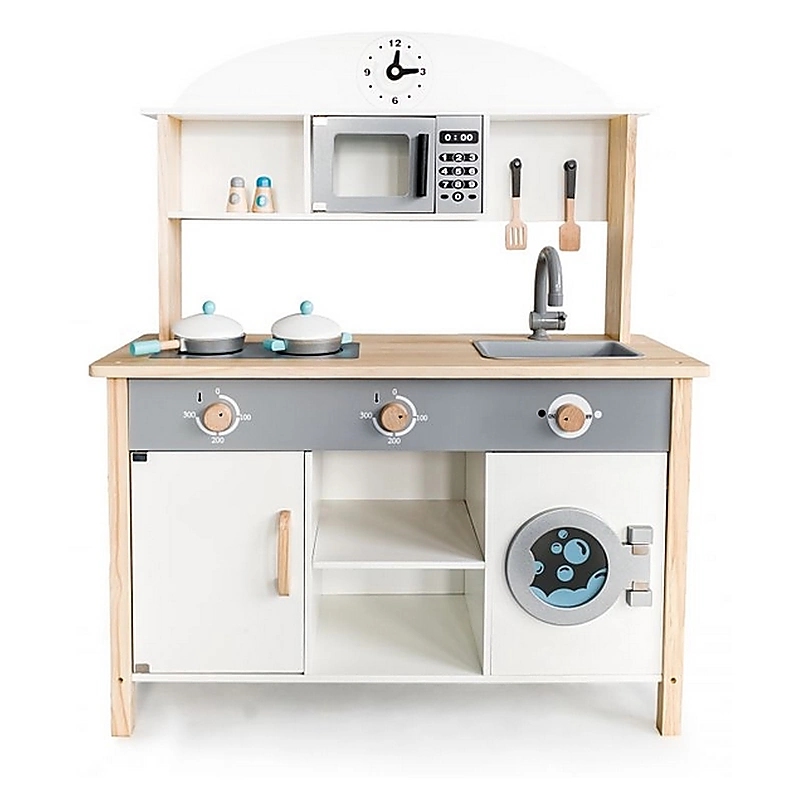 Dimensiunea ansamblului este generoasa, cu o usa mare, robinet mobil, cuptor cu microunde, masina de spalat functionala cu hublou, sunt functionale, se rotesc, inclusiv butoanele plitei. Aditional, sunt incluse 8 accesorii din lemn. Produsul are certificari SGS, CE EN71.