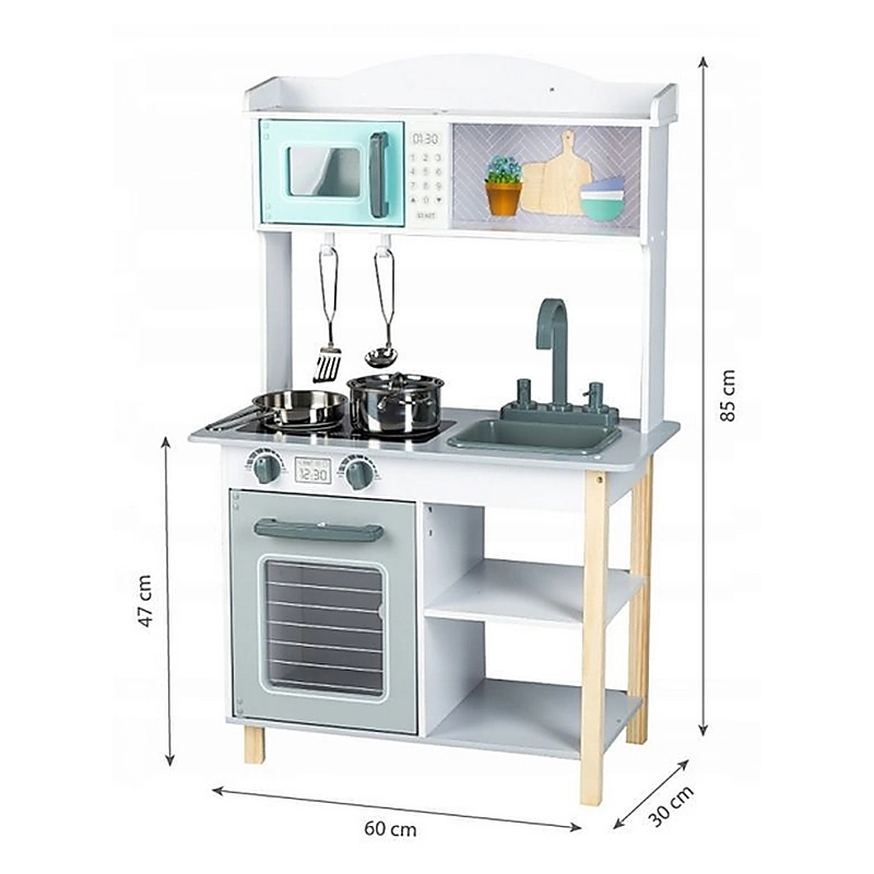• Bucătăria Ecotoys din lemn este dotată cu frigider, aragaz, cuptor, cuptor cu microunde, mașină de spălat și chiuvetă