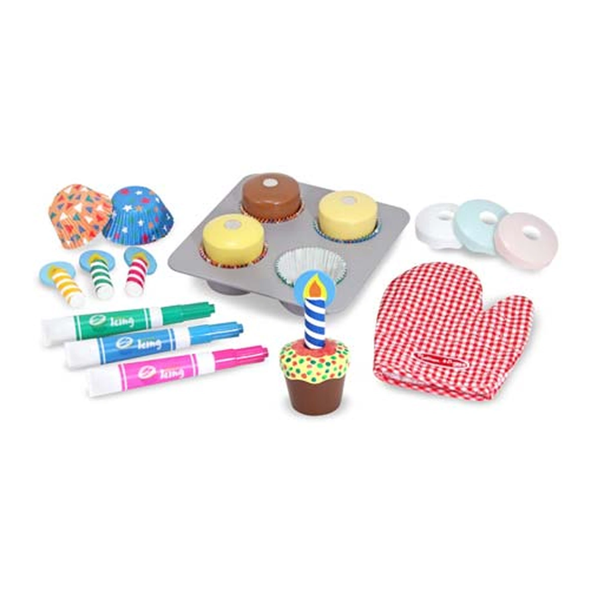 Ti-ai invitat prietenii la ceai? Atunci poti sa-i servesti si cu briose decorate chiar de tine! Setul contine 4 prajiturele din lemn cu 4 "topin-guri" din plastic, suporturi de hartie, tavita, lumanarele, manusa de bucatarie (nu uita sa o folosesti cand lucrezi cu tava) si carioci lavabile pentru decorare. Foloseste cariocile numai pentru decorarea toping-urilor din plastic, nu scrie cu ele direct pe lemn. Sterge "toping-urile" cu un servetel din hartie uscat si redecoreaza-le din nou. Dimensiuni cutie: 34 x 26 x 8 cm.