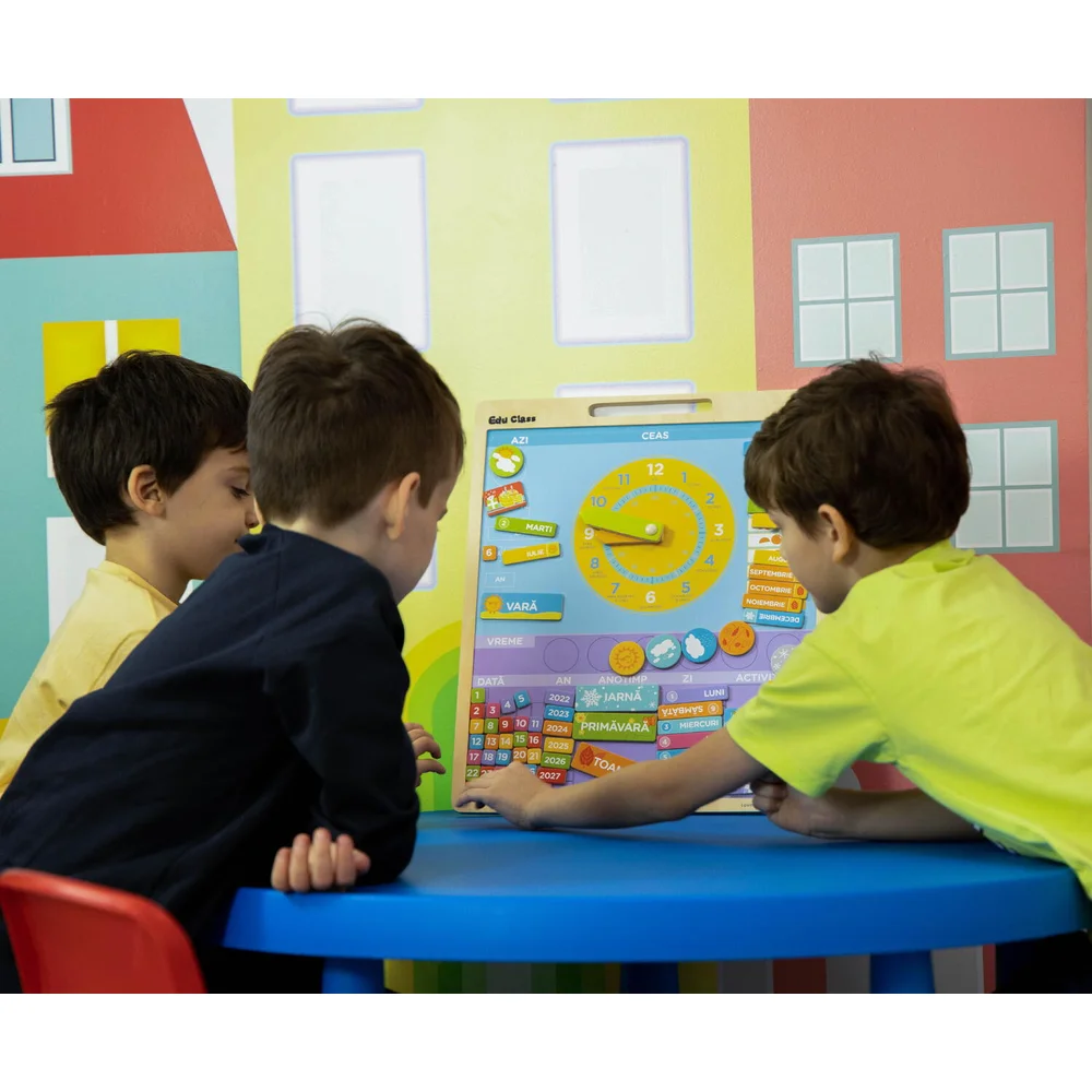 copilul invata succesiunea anotimpurilor, a lunilor anului, data si ora, cu ajutorul ceasului din centru
