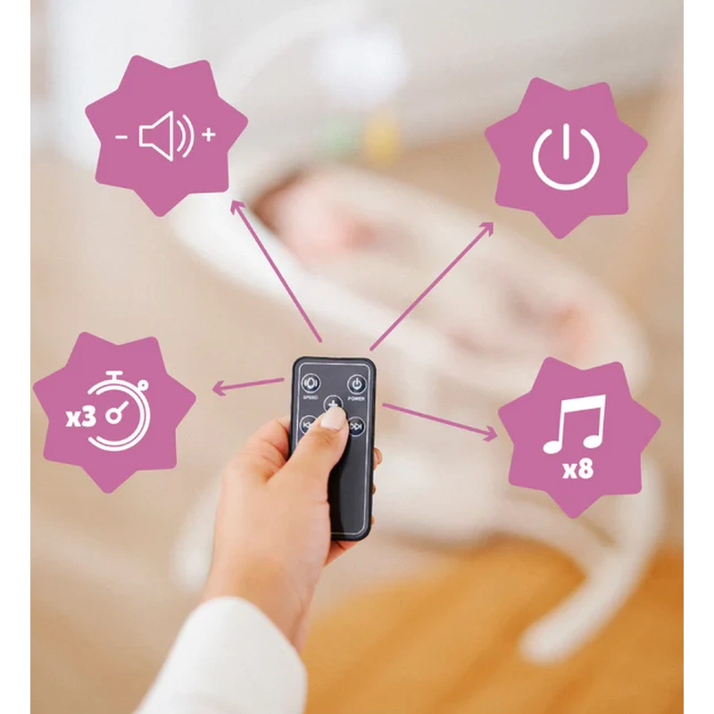 Si spre bucuria bebelușului tau (si a ta), leaganul canta si melodii blande si linistitoare. Pur si simplu utilizati functia din lateral pentru a selecta unul dintre cele 8 cantece de leagăn si reglati volumul.