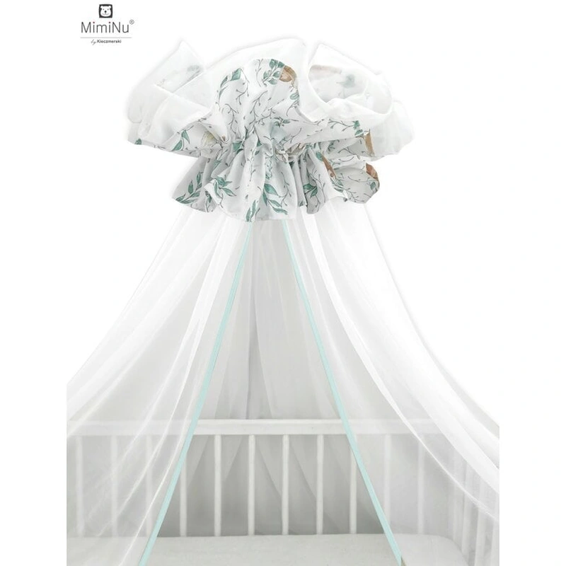 • Baldachinul este realizat din tul, ale carui ochiuri mici permit o buna ventilare a aerului, ferind totodata bebelusul de insecte.