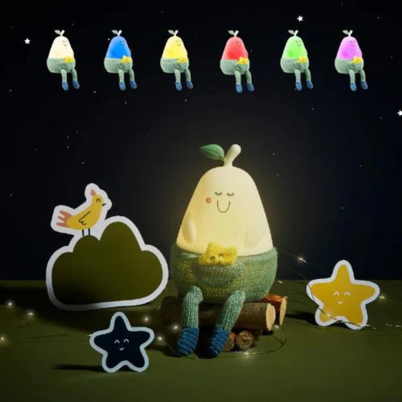 Lampa de veghe are o carcasa confectionata din silicon, intr-o forma jucarusa de para;