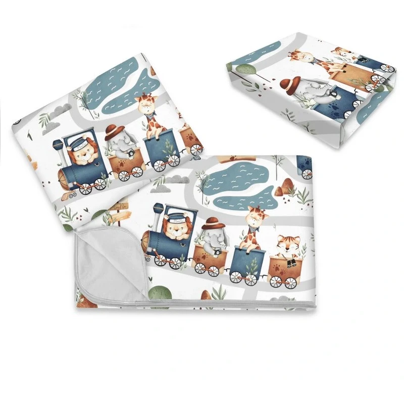 MimiNu Lenjerie patut cu 3 piese, MimiNu, Cu cearceaf 120x60 cm, paturica si pernuta, bumbac 100%, Zoo in train
