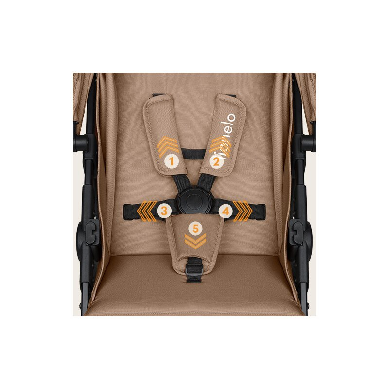 Copilul este securizat cu centuri reglabile in 5 puncte, care ofera protectie maxima. Centurile sunt echipate cu huse moi pentru a preveni iritatiile pielii.