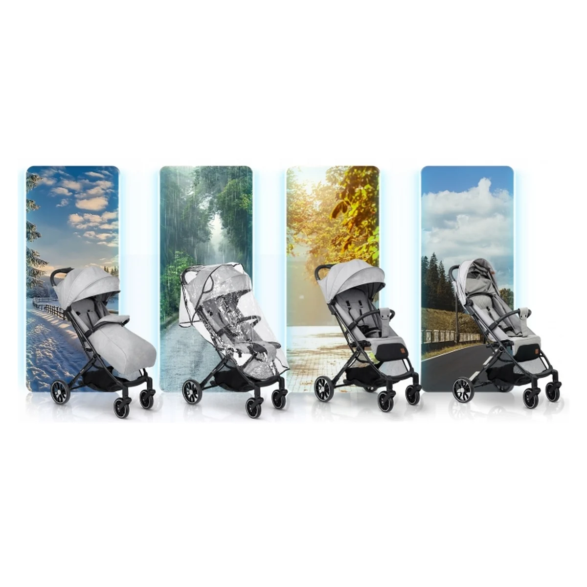• Rotile mari faciliteaza navigarea pe teren denivelat, iar o husa de ploaie va protejeaza copilul de umiditate;