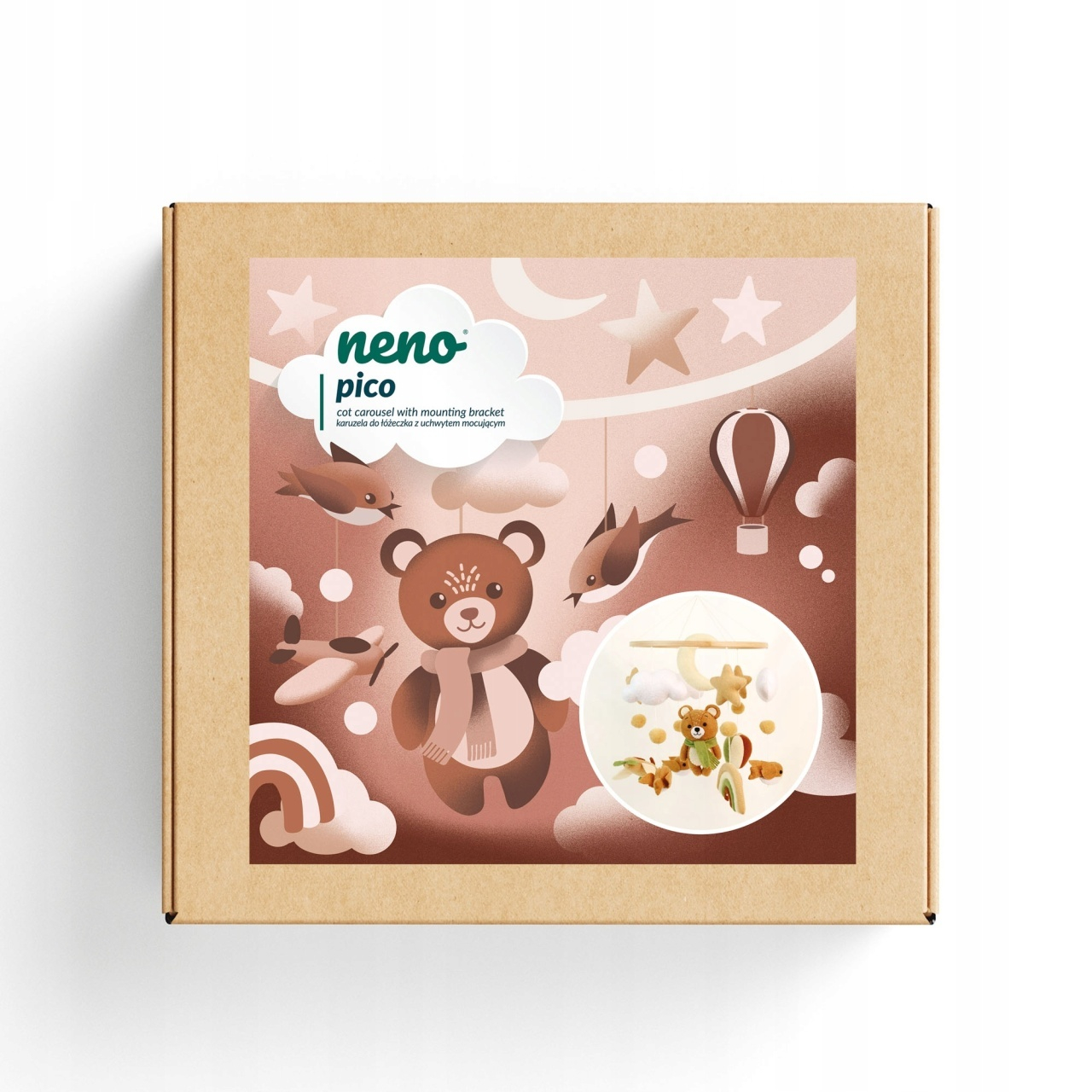 Neno Pico este un carusel adorabil, realizat manual, care îmbină materiale naturale cu un design delicat și minimalist. Urșii, norii și stelele care se leagănă ușor deasupra pătuțului creează o atmosferă calmă și plină de căldură, sprijinind în același timp dezvoltarea timpurie a bebelușului.