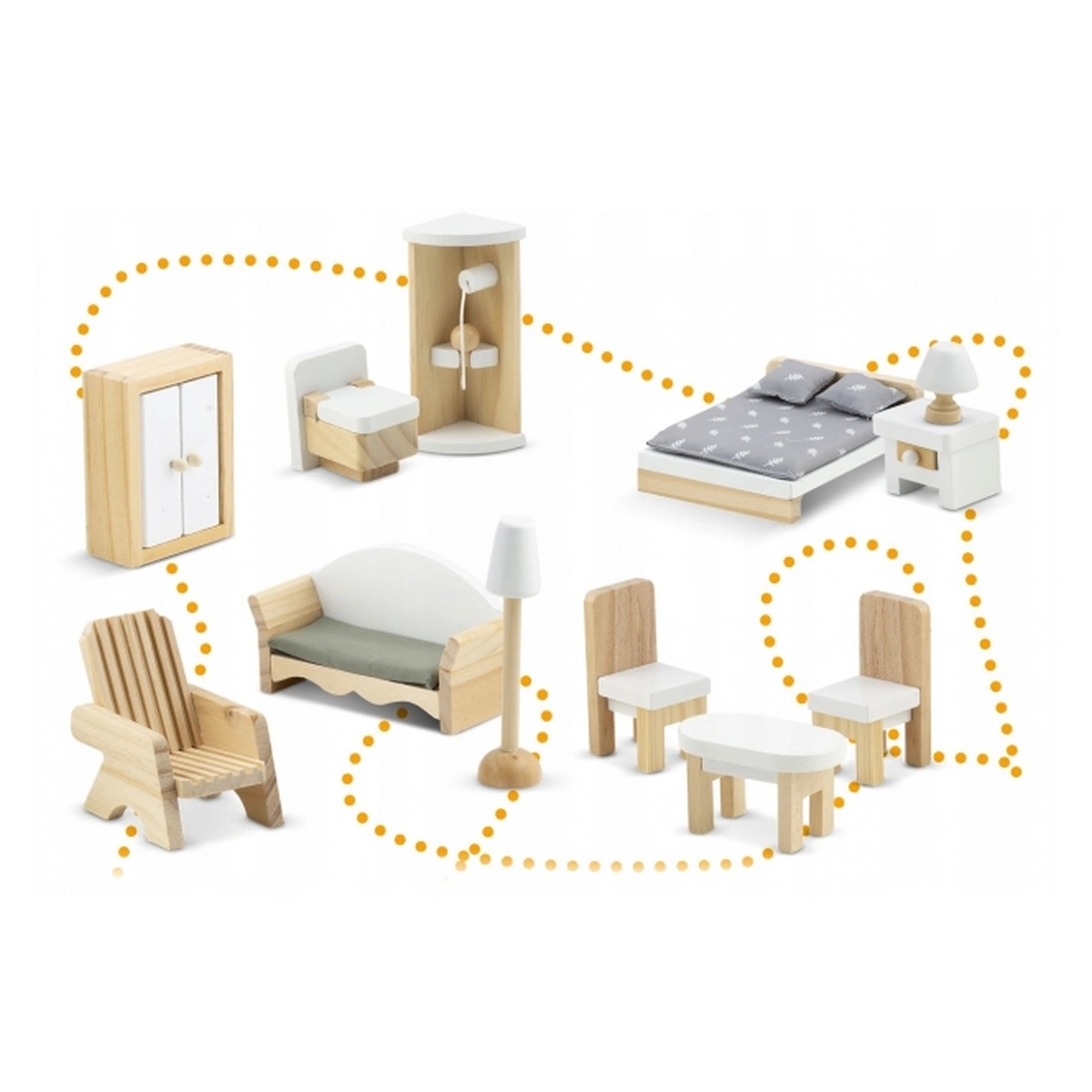 11 piese de mobilier din lemn incluse: masa cu scaune, canapea, lampadar, pat, toaleta, dus, sezlong, noptiera, veioza, dulap