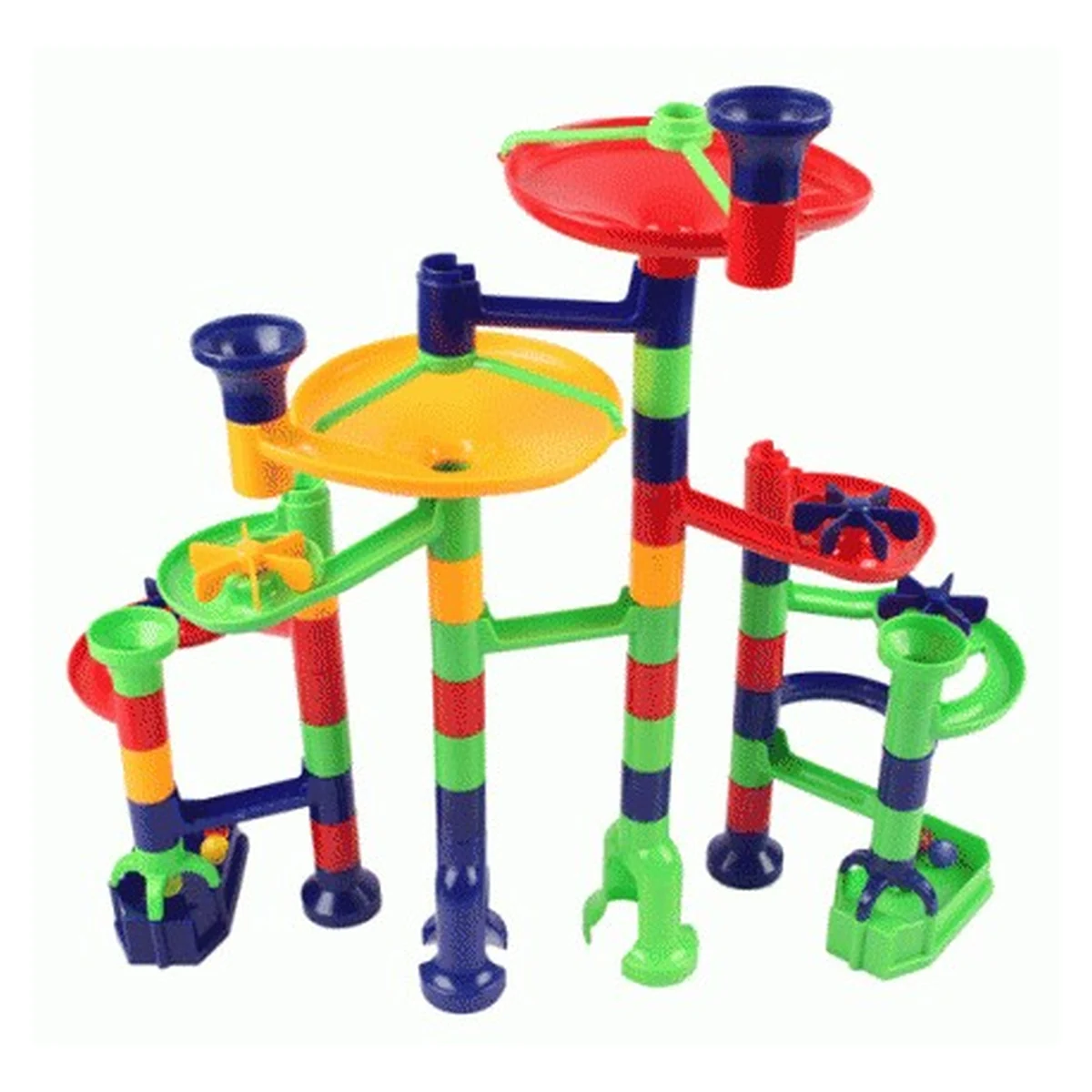 Setul include 56 de piese (tuburi, sine, ruleta, module pentru schimbarea directiei bilelor) care permit asamblarea intr-o multime de combinatii.