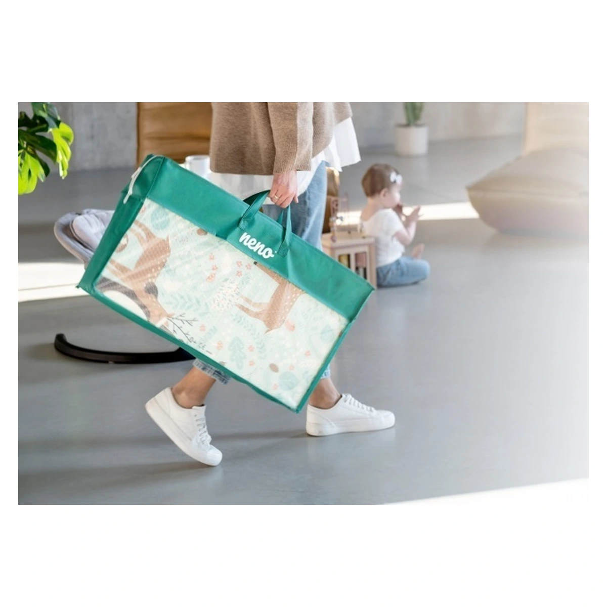 Te pregătești de vacanță și vrei să iei Neno Mondo cu tine? Micuțul tău va fi cu siguranță încântat! Pur și simplu pliază covorașul, pune-l în husa practică cu mâner și depozitează-l în portbagaj.