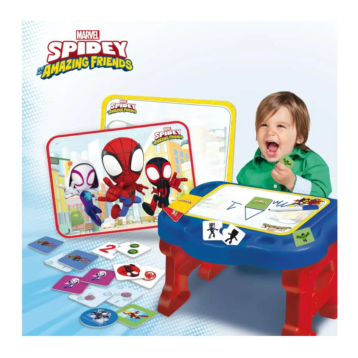 - o parte a masutei este dedicata unei table de scris si sters, unde copiii pot utiliza markere speciale pentru a desena si scrie pe aceasta tablita, oferindu-le o modalitate creativa de exprimare