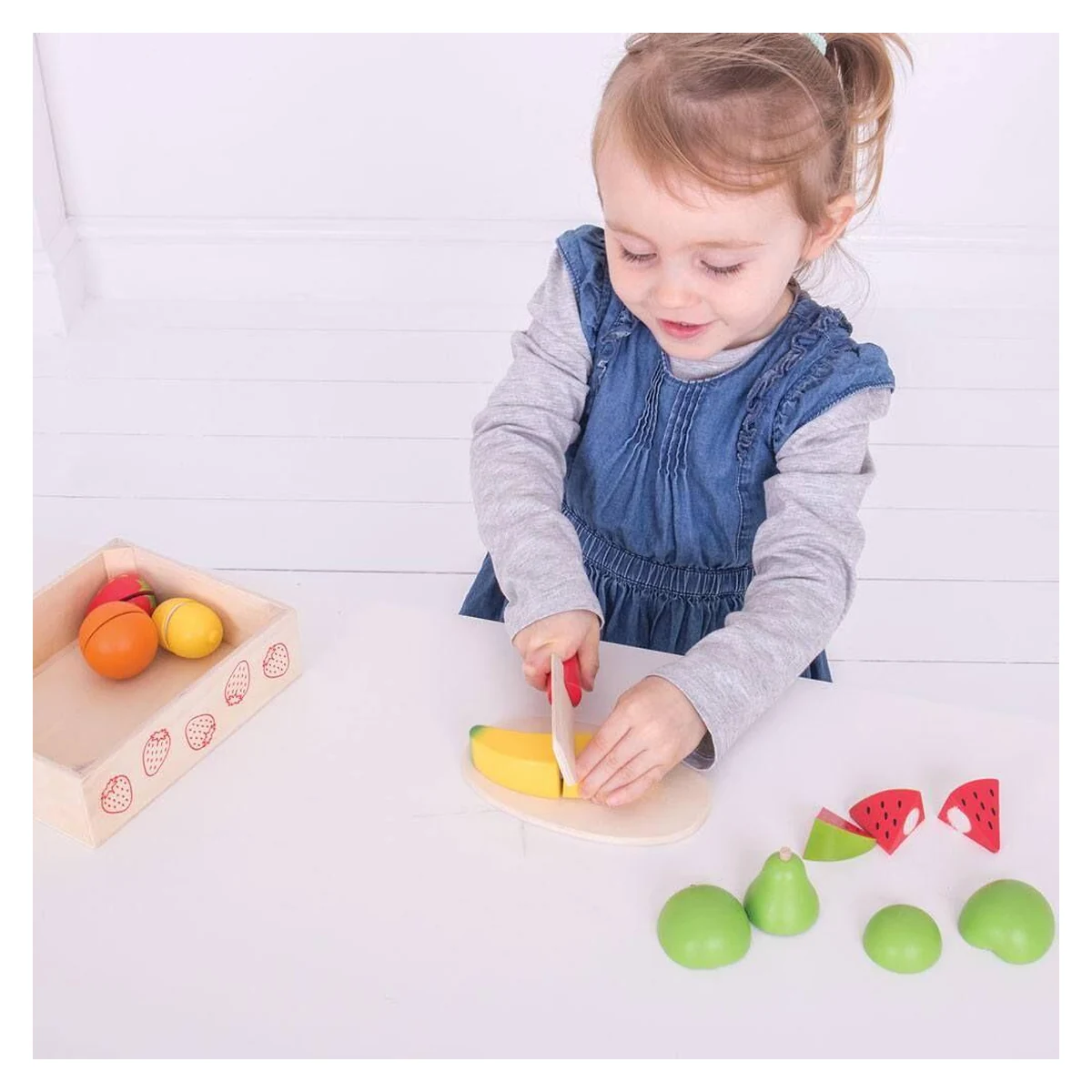 Cutiuta din lemn contine fructe ce pot fi "taiate" precis cu ajutorul cutitului din lemn.