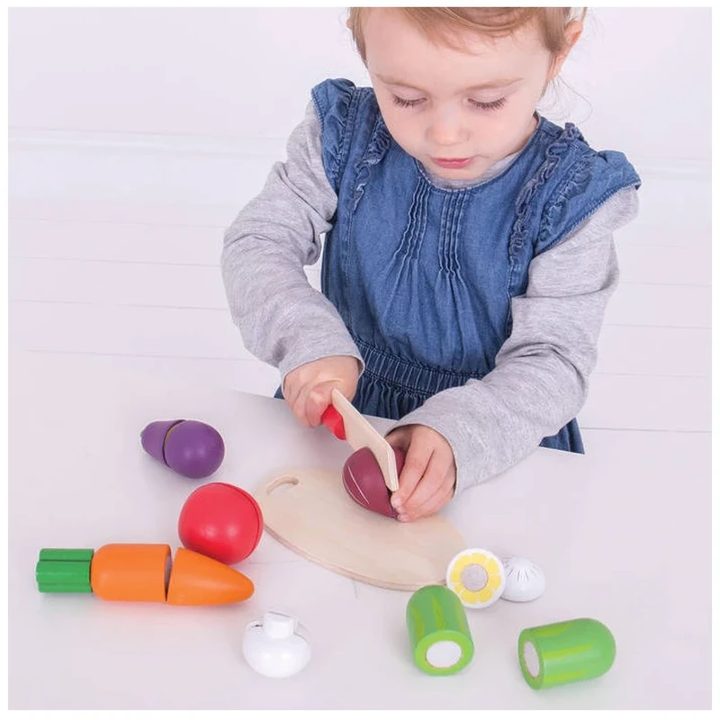 Cutiuta din lemn contine legume ce pot fi "taiate" precis cu ajutorul cutitului din lemn.