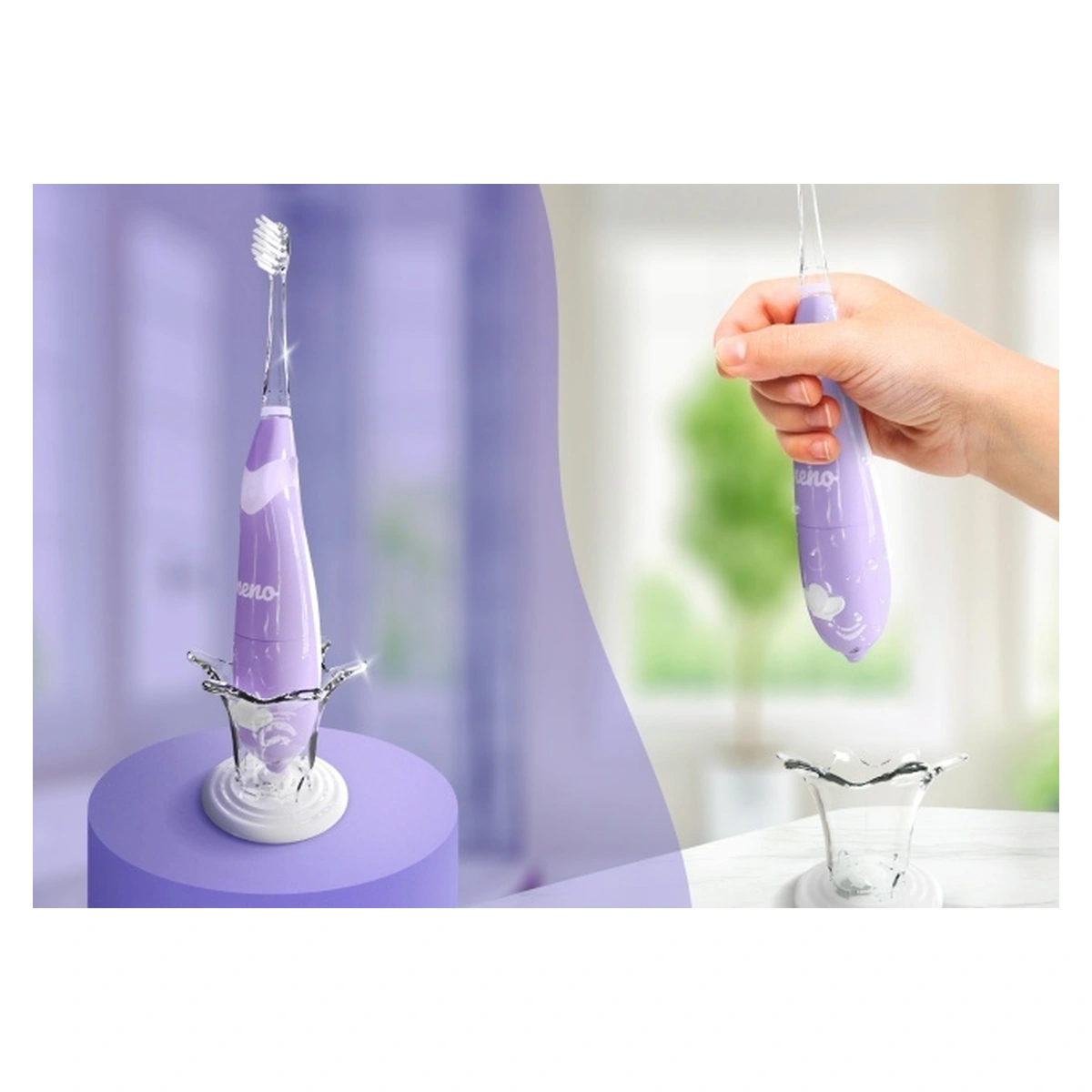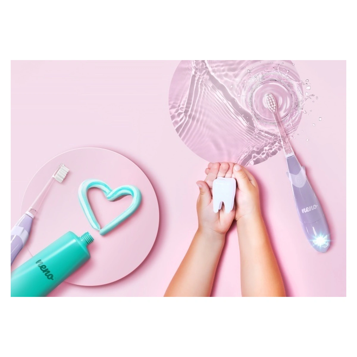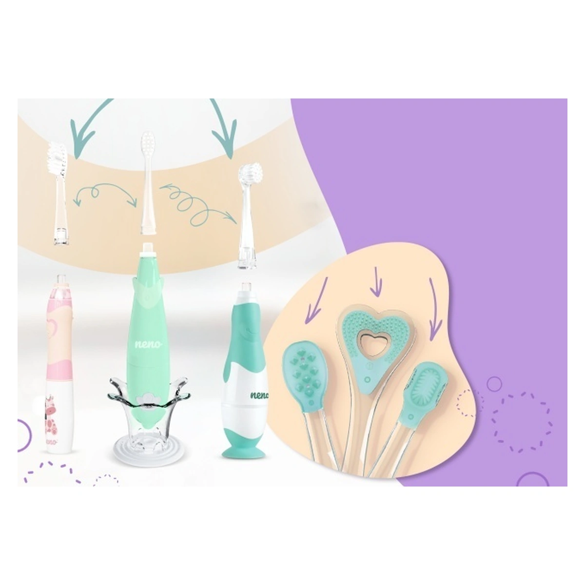 Cu Neno Tutti, beneficiezi de soluții atât practice, cât și inovatoare. Un exemplu este suportul inclus în set, care oferă periuței o poziție stabilă. Datorită acestuia, poți fi sigur că periuța nu va cădea pe podea și va fi mereu la îndemână.