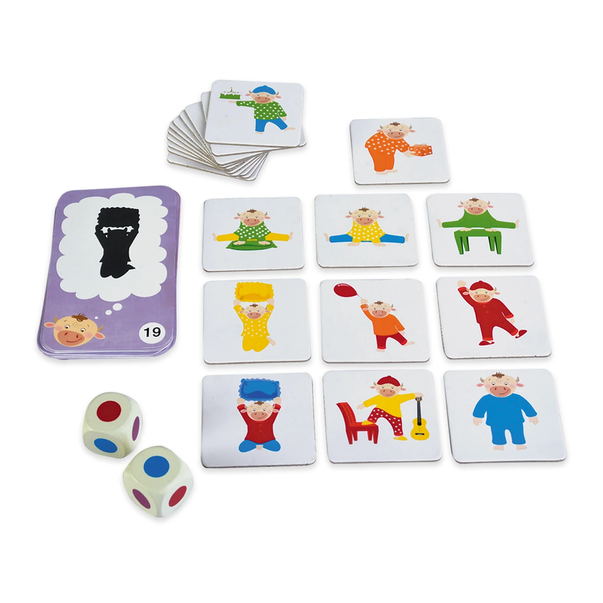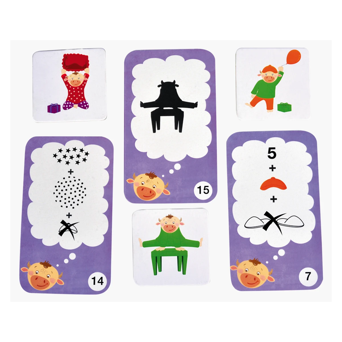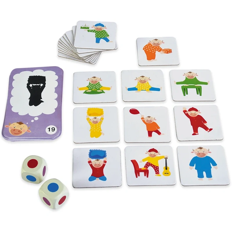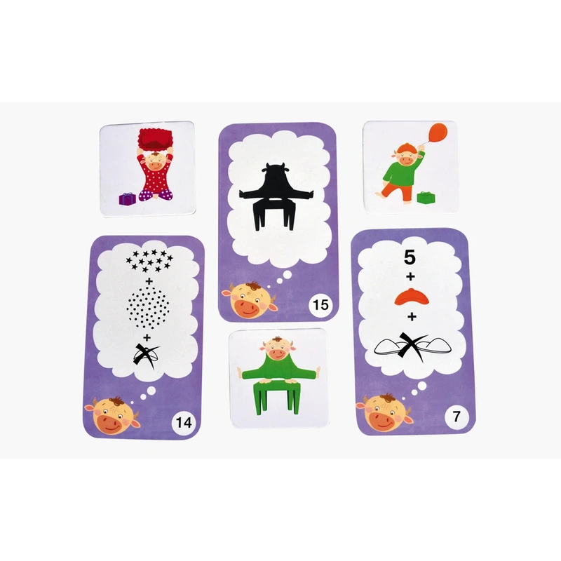 Regulament: Cele 21 de jetoane cu prietenii lui Marvin sunt imprastiate cu fata in sus pe o suprafata dreapta. Jucatorul care striga cel mai tare “Moo” incepe primul jocul. El trebuie sa dea cu ambele zaruri. Toti jucatorii incep sa caute cardul cu vacuta imbracata in combinatia de culori indicata de zaruri. Primul jucator care atinge jetonul cu vacuta respectiva il castiga. Jocul se incheie cand jetonele se termina. Jucatorul cu cele mai multe jetoane cu vacute este castigator. A doua varianta de joc presupune sa gasesti primul vacuta, bazandu-te pe caracteristicile si cerintele indicate de cardurile cu probleme de logica. Cele 21 de jetoane cu prietenii vacutei Marvin Moo sunt imprastiate cu fata in sus pe o suprafata dreapta. Amesteca cardurile cu probleme de logica si asaza-le teanc cu fata in jos. Jucatorul care striga cel mai tare “Moo “ incepe jocul si trage un card cu o problema de logica din teanc. Toti jucatorii incep sa caute jetonul cu vacuta care are caracteristicile indicate de card. Spre exemplu, daca pe card vei gasi o stea si cifra 6, trebuie sa cauti un jeton cu 6 obiecte si o vacuta care este imbracata intr-o pijama cu stea. Primul jucator care atinge jetonul corespunzator il ia si il arata celorlalti. Daca alegerea este corecta, jucatorul pastreaza cardul cu problema de logica si pune la loc jetonul. Jocul ia sfarsit cand toate problemele de logica au fost rezolvate. Jucatorul care a strans cele mai multe carduri castiga.