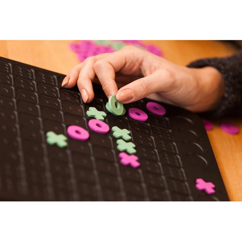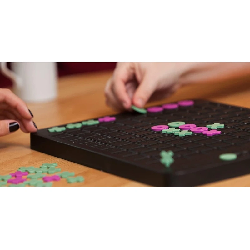 Regulament: obiectivul jocului este de a obtine 5-in-linie, in orice forma (X sau O) sau in orice culoare ai (verde sau roz). Pare simplu, dar trebuie sa gandesti bidimensional, sa nu te folosesti doar de piesele proprii, ci si de piesele adversarului pentru a obtine 5-in-linie. Cand reusesti sa faci 5-in-linie, castigi un numar de puncte in functie de pozitia liniei pe tabla de joc. Castigi jocul cand ai castigat 3 seturi sau cand ai fost atat de ingenios incat ti-ai facut partenerul knockout.