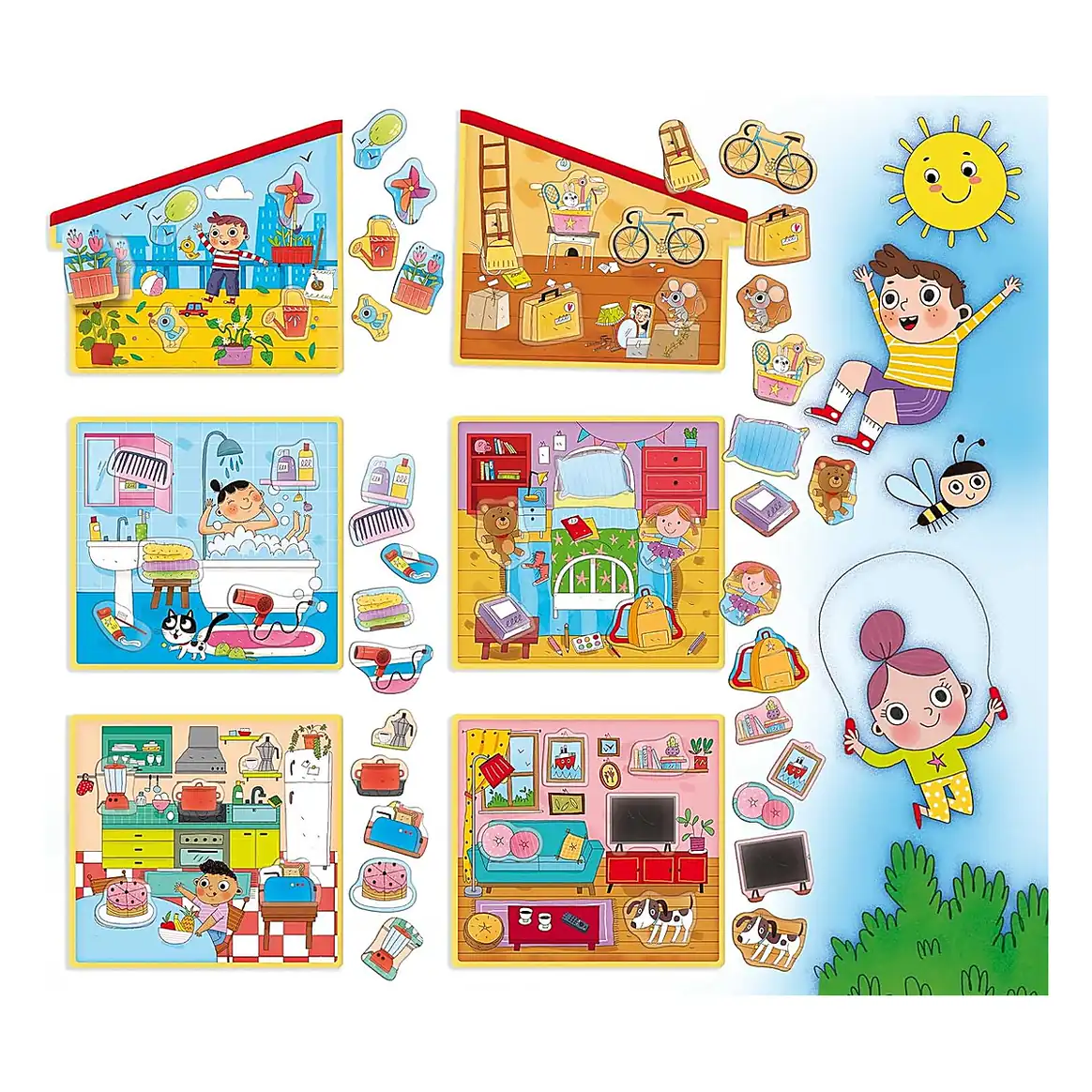 - setul include piese durabile din carton din care vor forma o casa cu mai multe incaperi, fiecare ilustrand un spatiu diferit, cum ar fi bucataria, dormitorul, baia si sufrageria