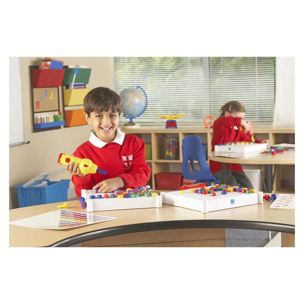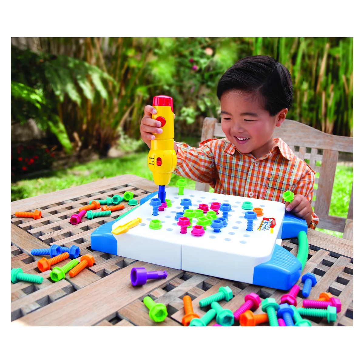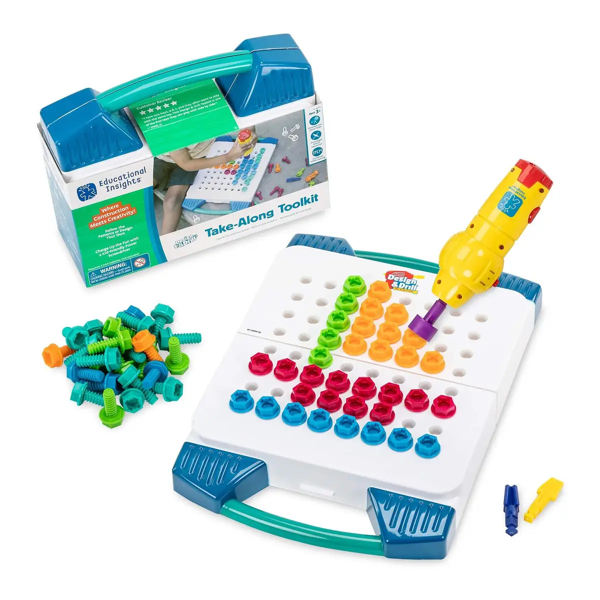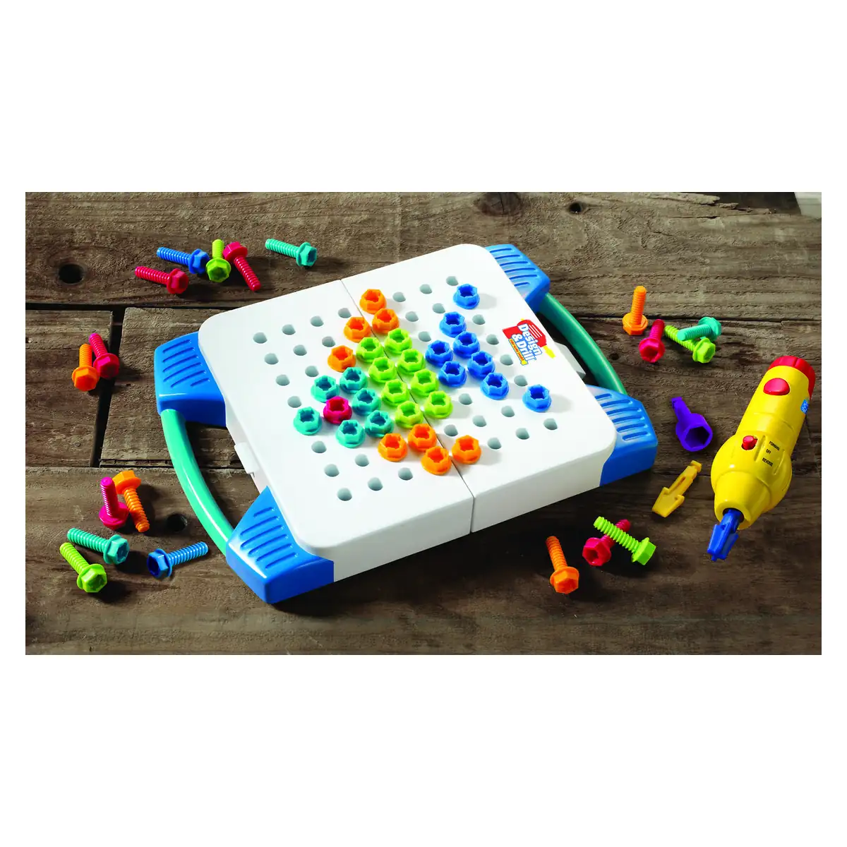 Setul include 60 de suruburi in 5 culori vibrante, surubelnita electrica galbena, ghidul de activitati.