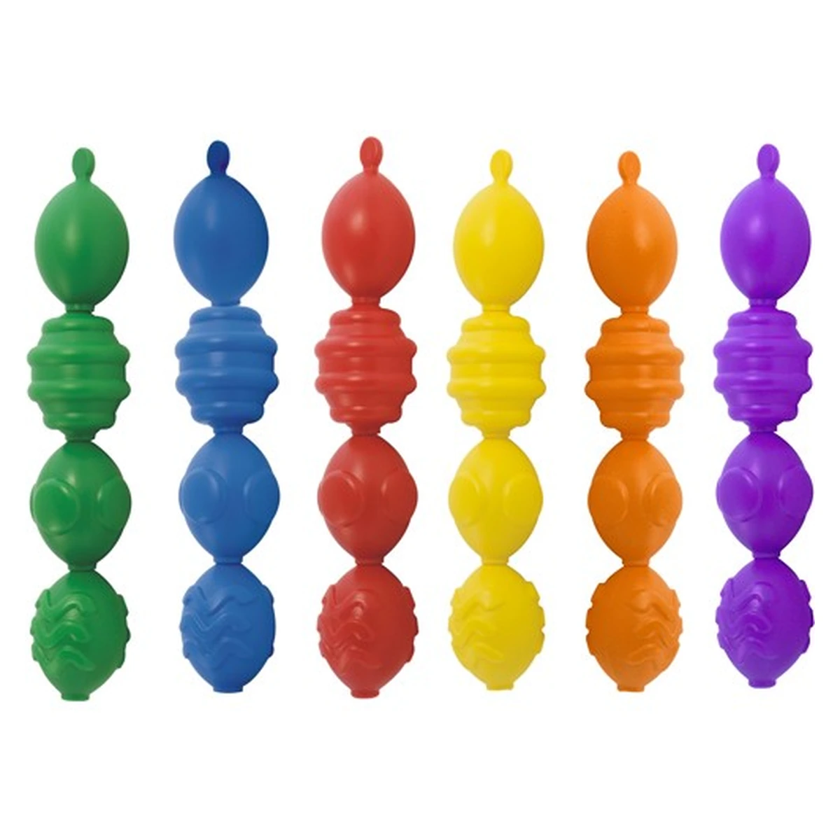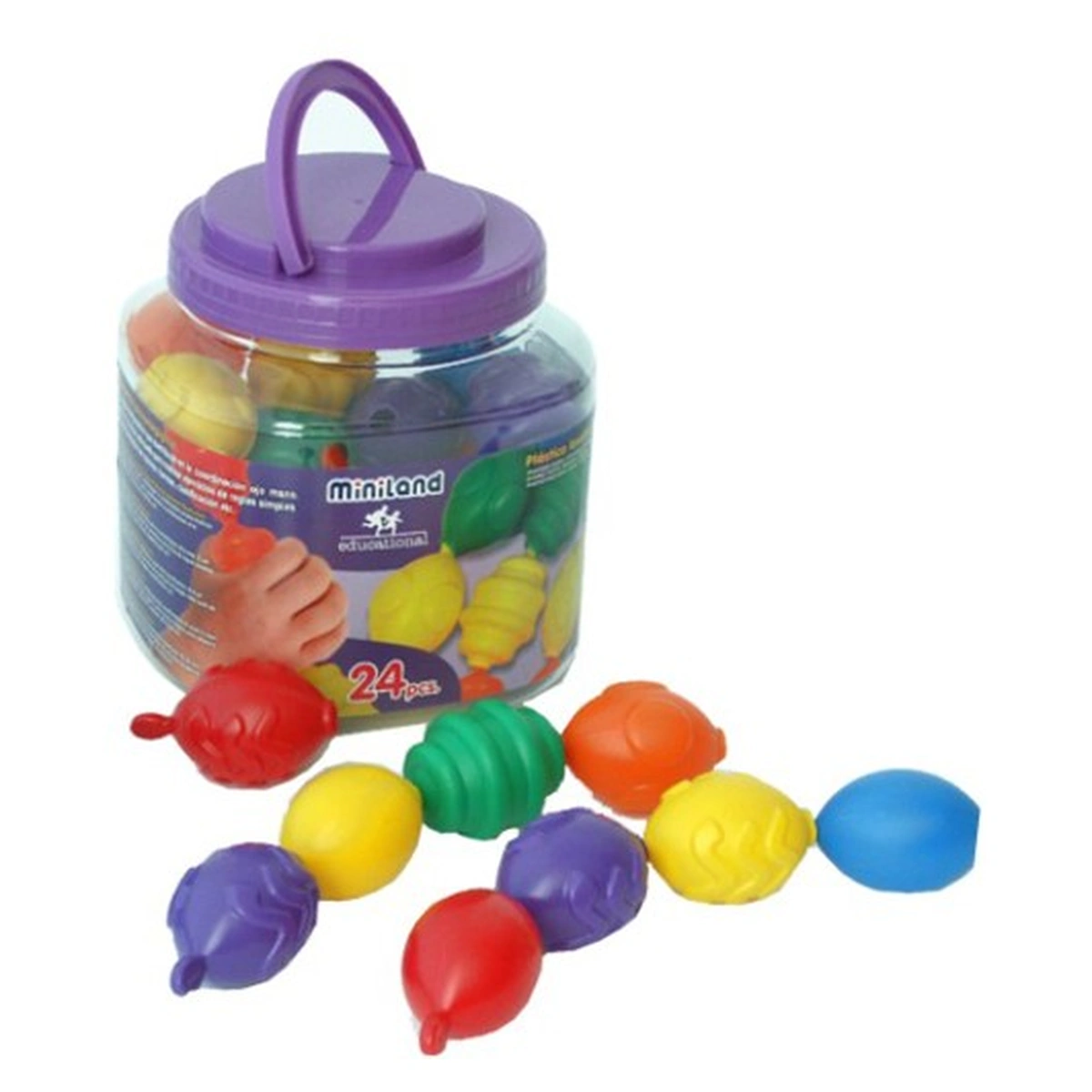 Jocul contine 24 de piese mari de 8 cm din plastic rezistent si flexibil, cu forme rotunjite, cu texturi si culori diferite, usor de apucat si manevrat de catre cei mici, carduri cu secvente de asamblare, toate intr-o cutie practica si cu maner.