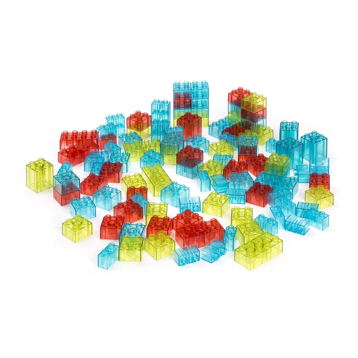 Jocul de construcții contine 100 bucăți de diferite dimensiuni și culori care se potrivesc.