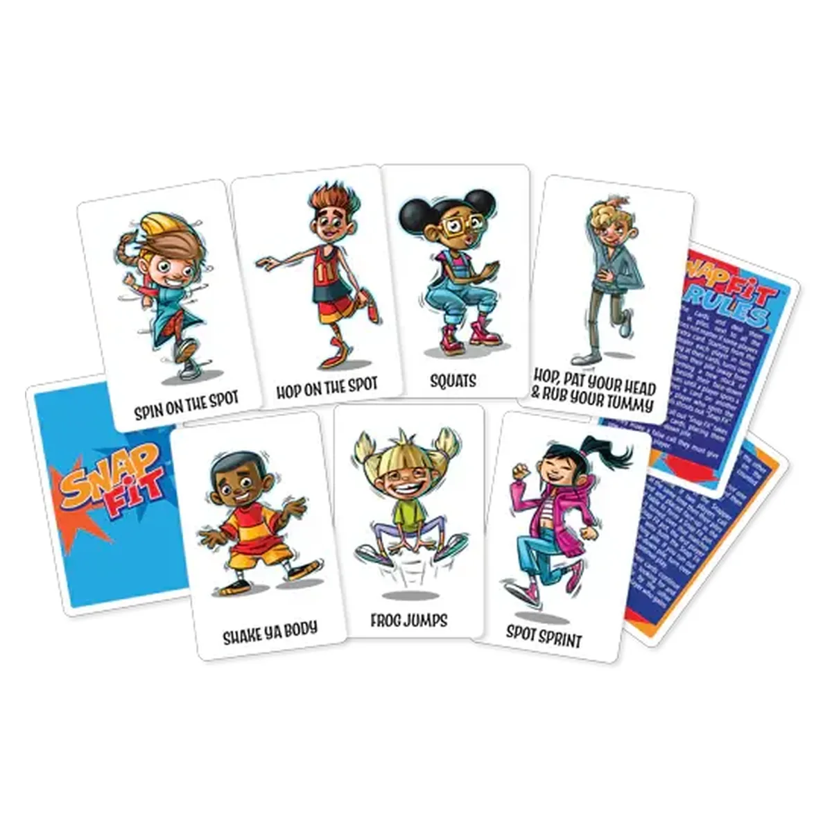 - Fii primul care observa cartile identice si striga „Snap Fit!” ca sa castigi… iar ceilalti trebuie sa faca actiunea trasnita de pe carti… timp de 10 secunde