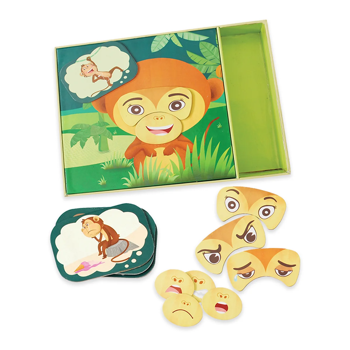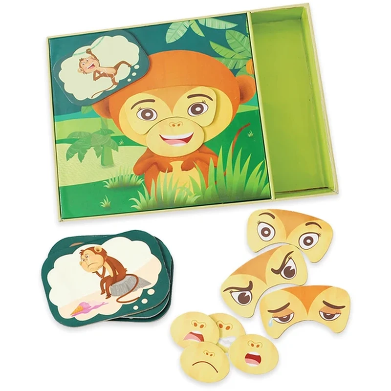 Nivelul 3: Asociere - Puneti un card cu imagine (gand) deasupra capului maimuticii. Observati ce se intampla si rugati-l pe copil sa ghiceasca sentimentul, sa il denumeasca si sa faca cu ajutorul pieselor de joc maimutica cu acel chip.