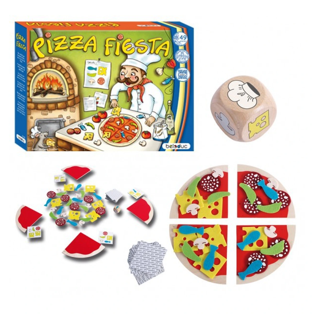 Jocul include: 4 felii de pizza, 6 ciuperci, 6 ardei, 6 pești, 6 bucati de branza, 6 felii de salam, 14 pizza - carduri, 1 zar cu simboluri și instrucțiuni în limba engleză.