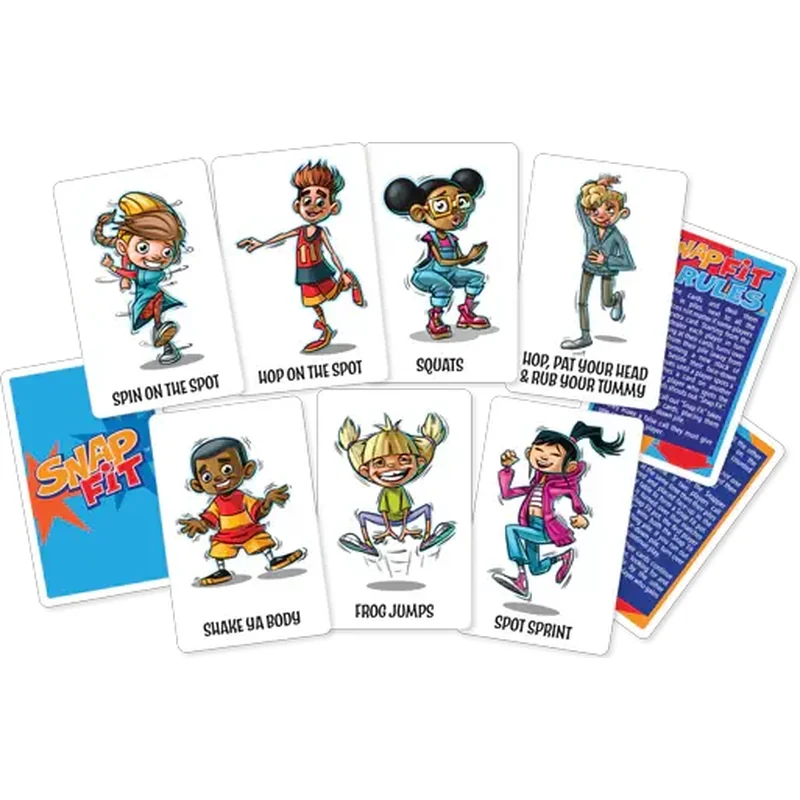 • Fii primul care observa cartile identice si striga „Snap Fit!” ca sa castigi… iar ceilalti trebuie sa faca actiunea trasnita de pe carti… timp de 10 secunde