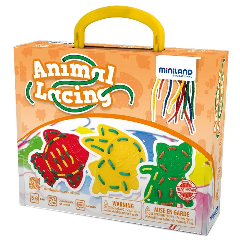 Siluete de animale din plastic gros si rezistent ce asteapta sa fie insiretate. Joc educativ ce dezvolta abilitatile de coordonare ochi-mana, miscarile fine, rabdarea.