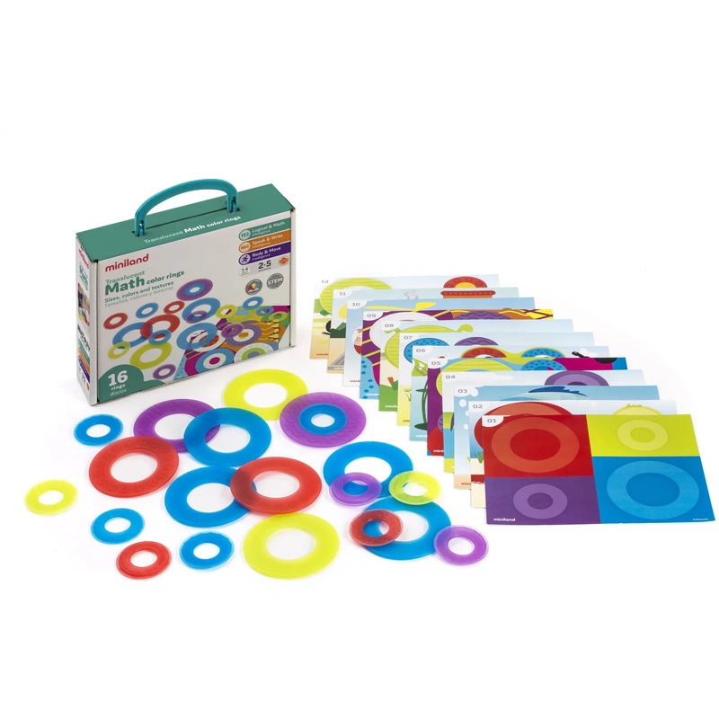 Jocul contine un set de 16 cercuri translucide și 12 cărți de activitate cu diferite teme și grade de dificultate, cu care să lucrezi la diferențierea dimensiunilor, culorilor și texturilor.