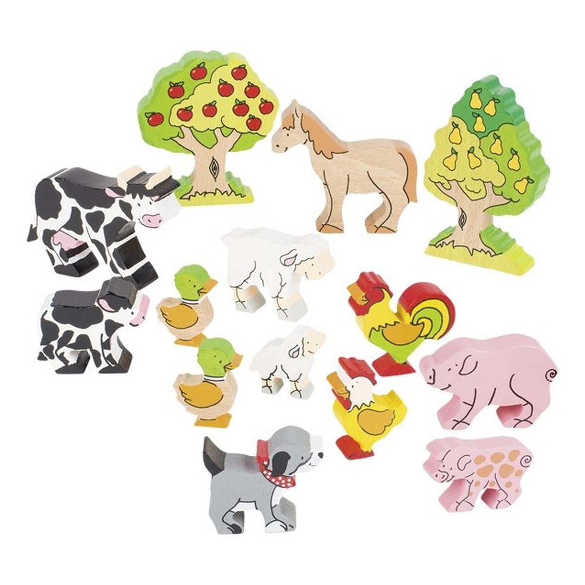 Setul include 14 piese din lemn, dintre care 12 animale si 2 pomi.
