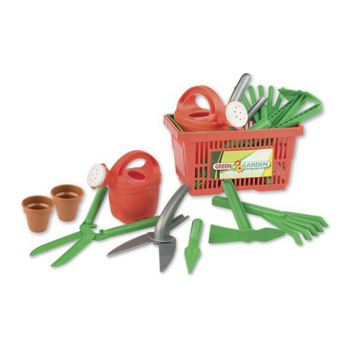 Setul include 1 buc. stropitoare, 1 buc. foarfece de gradina, 1 buc. grebla, 2 buc. ghivece de flori si altele.