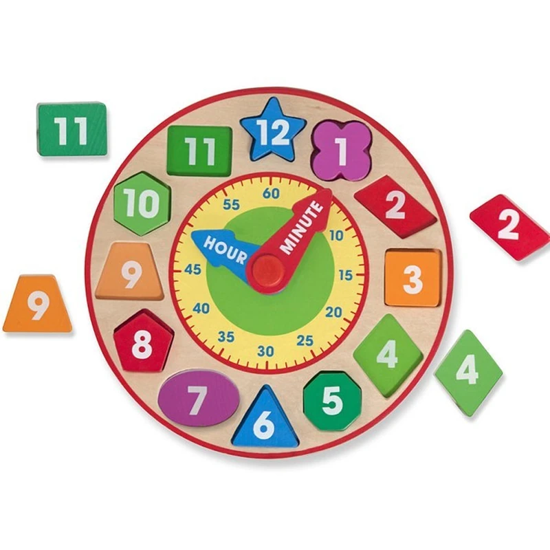 Invata ceasul! Un minunat ceas din lemn cu 12 forme maracte cu cifre, fiecare reprezentand o anumita forma geometrica. Fiecare forma se potriveste, bineinteles, intr-o singura pozitie pe ceas. Are si doua brate pe care copilul le poate roti singur, ajutandu-l astfel sa invete acest concept abstract  numit ?timp?. Ceasul are marcate si minutele, din 5 in 5. Formele geometrice care reprezinta orele au culori si nuante diferite, ajutand la invatarea acestora. Dimensiuni ambalaj: 25 * 25 * 9 cm.