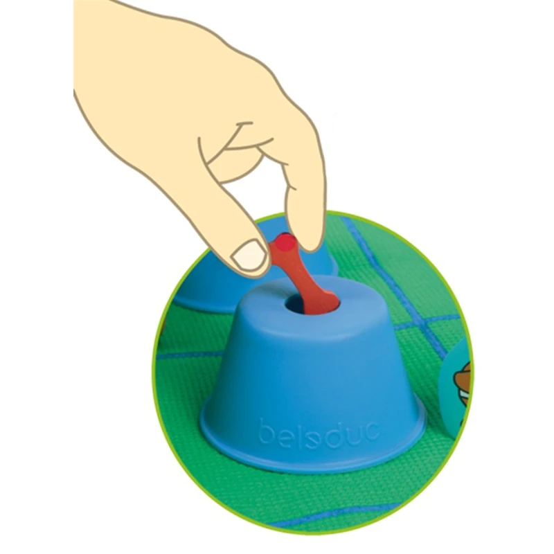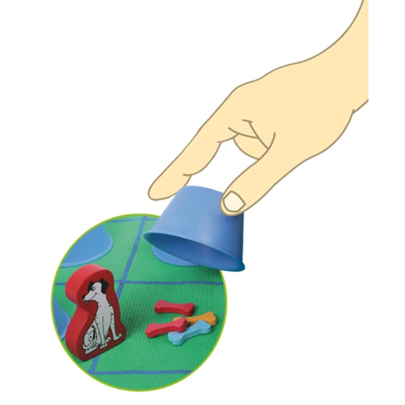 Jocul contine: suportul pentru joc, 9 castronase, 16 oase (4 albastre, 4 rosii, 4 verzi si 4 galbene), 4 figurine catei si 4 carduri pentru depozitare.