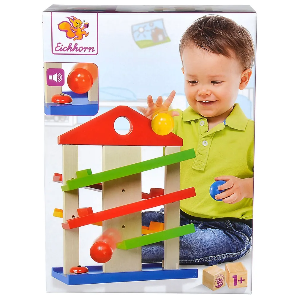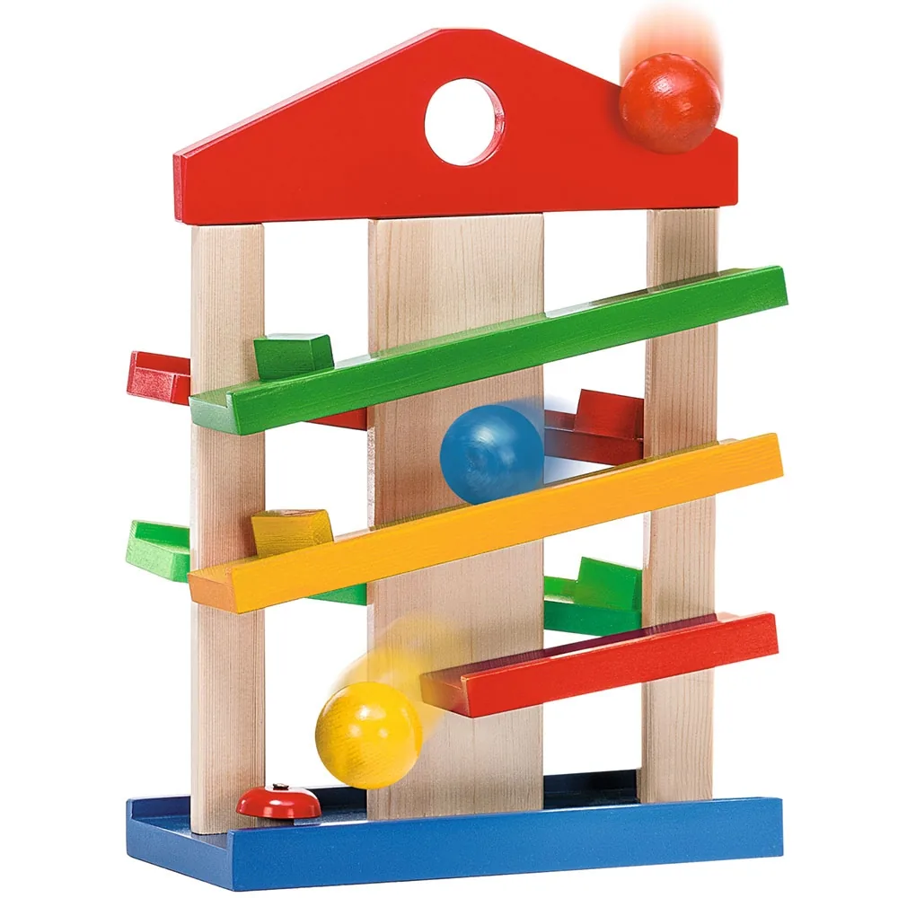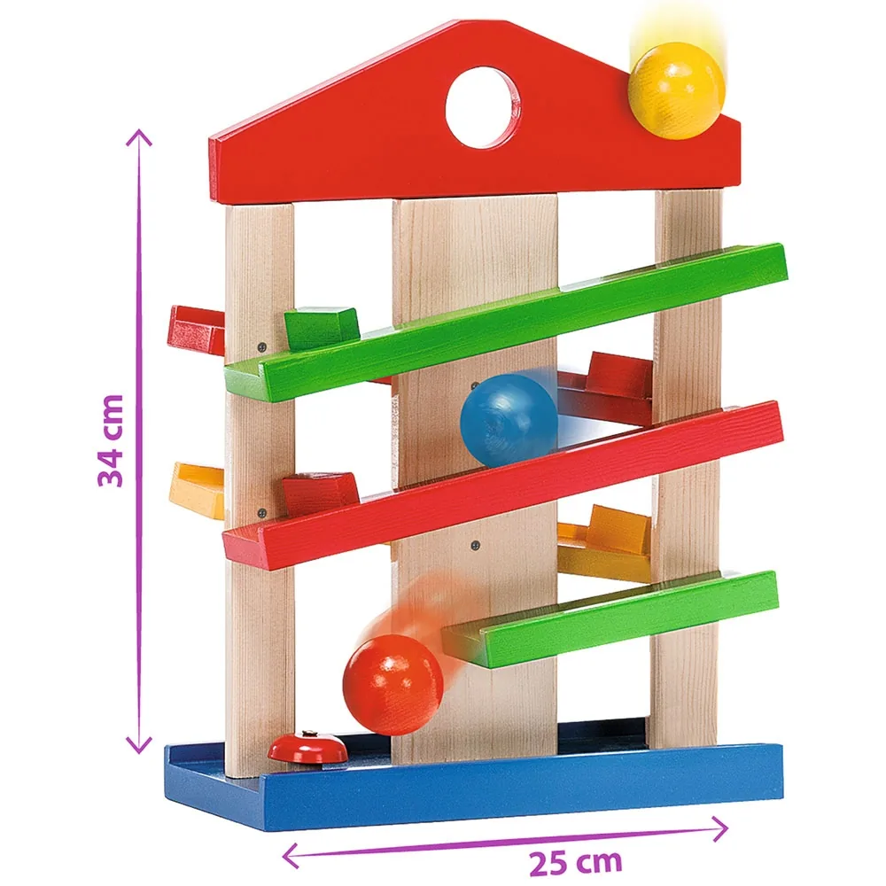 - Bilele se pozitioneaza in partea de sus si se rostogolesc pana jos, urmand traseul. Astfel, micutii vor fi atrasi de aceasta jucarie cu bile, modalitatea in care bila va ajunge de pe o pista pe alta le va capta atentia