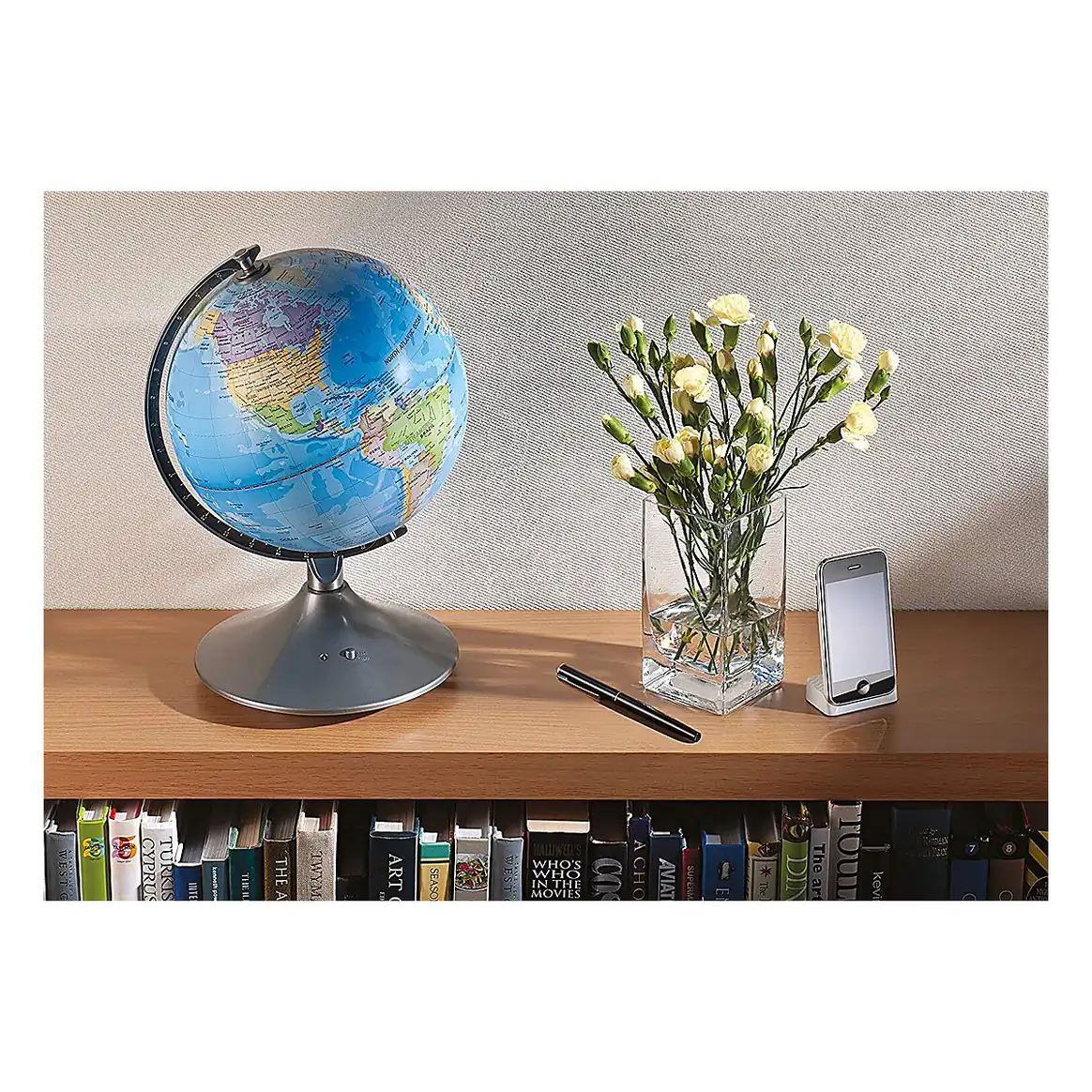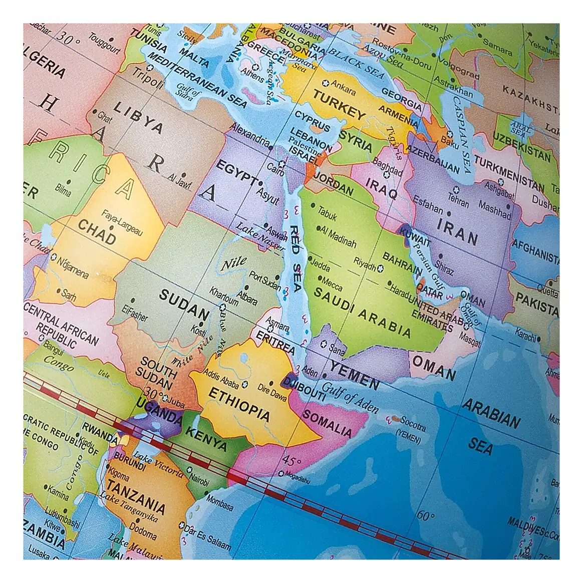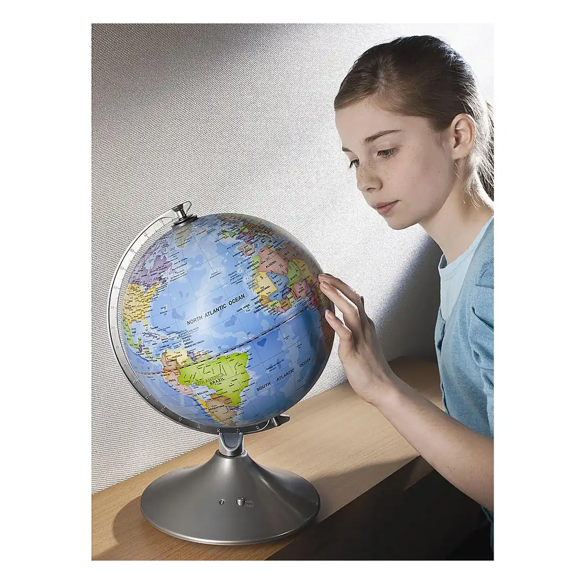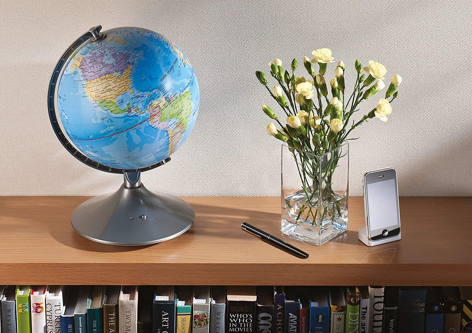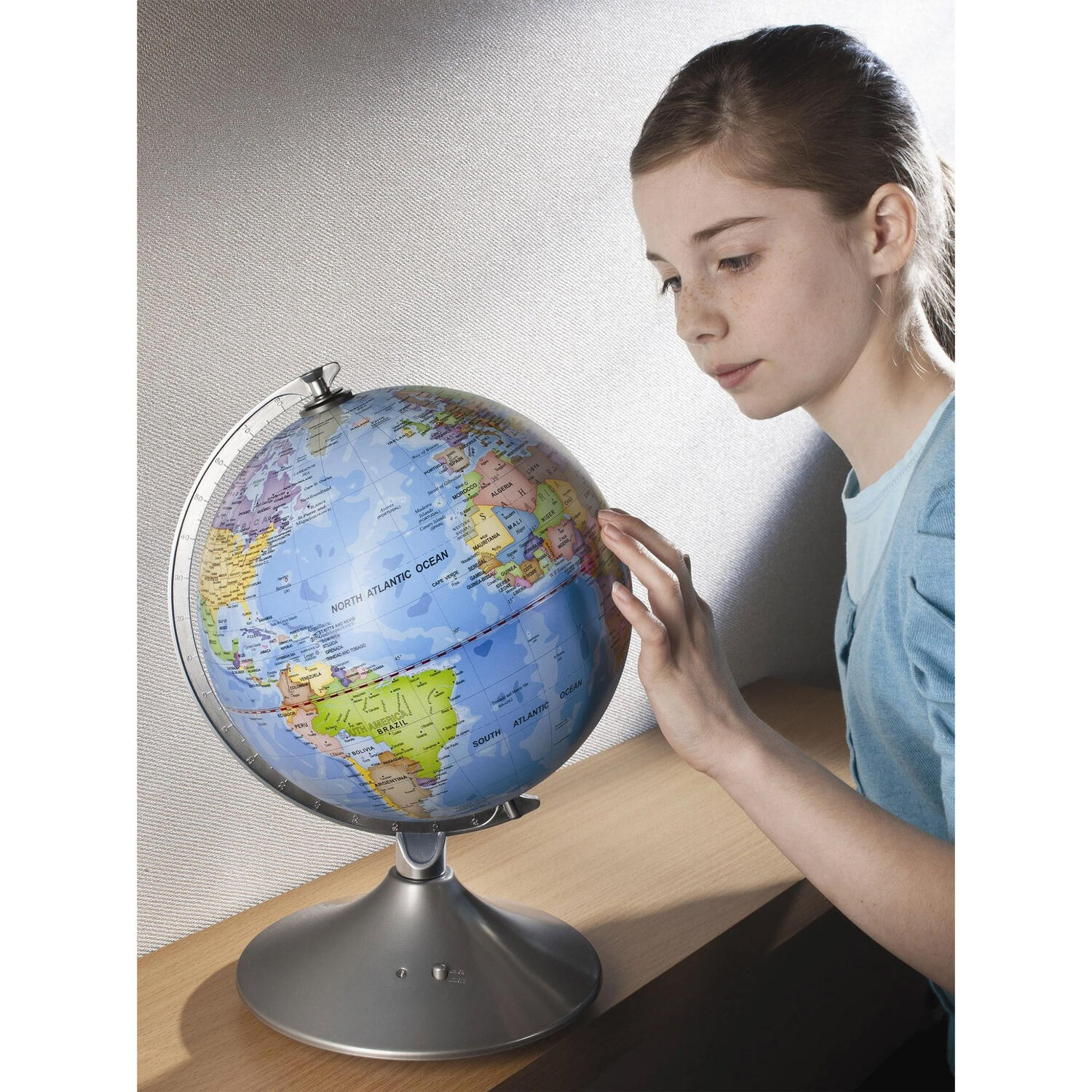 - pe timp de zi, pe glob poti analiza in detaliu granitele politice, oceanele, ecuatorul, liniile de longitudine si latitudine, numele tarilor, capitalele, precum si orasele importante din fiecare tara a lumii