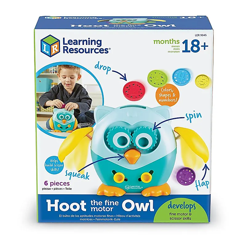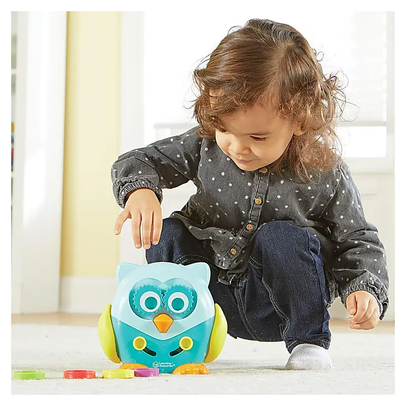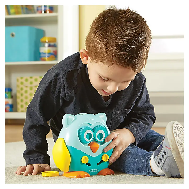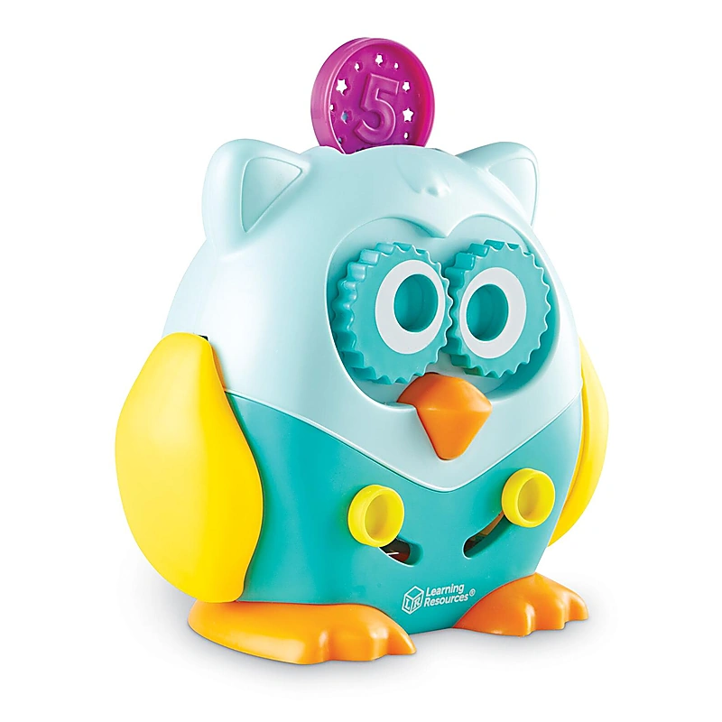 - copiii exerseaza prinderea prin rotirea ochilor bufnitei, isi construiesc forta in manute prin apasarea nasului si isi dezvolta coordonarea ochi-mana prin inserarea monedelor prin orificiul aflat pe capul bufnitei