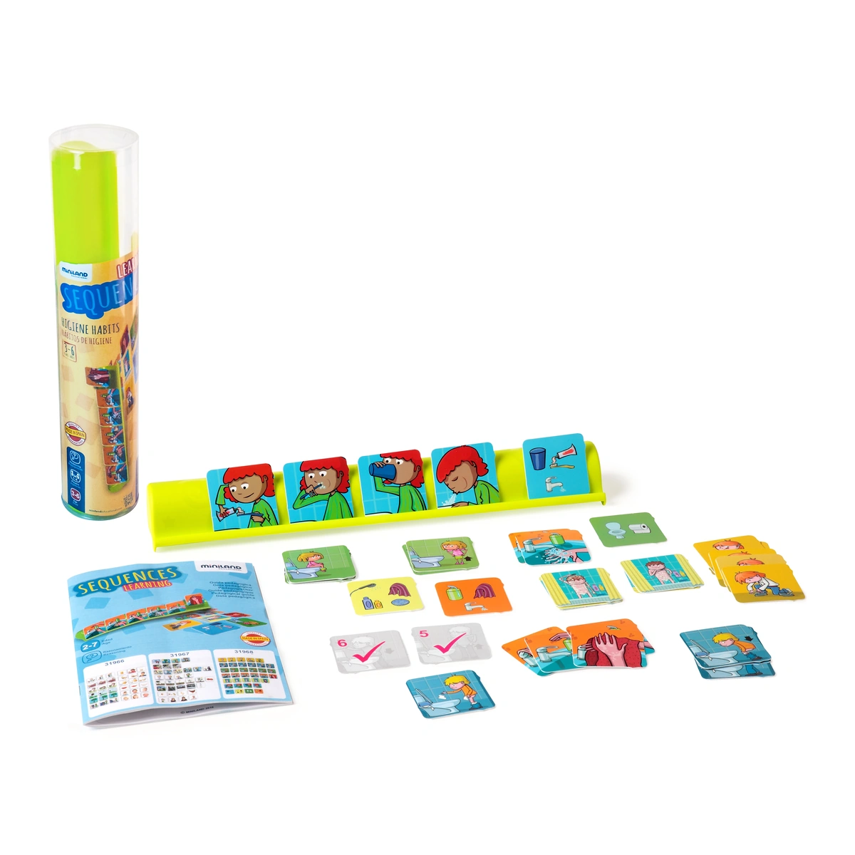 Secvente de invatare: obiceiurile de igiena, carduri cu momente legate de diferite domenii de igiena de zi cu zi, care urmeaza a fi puse intr-o ordine secventiala.