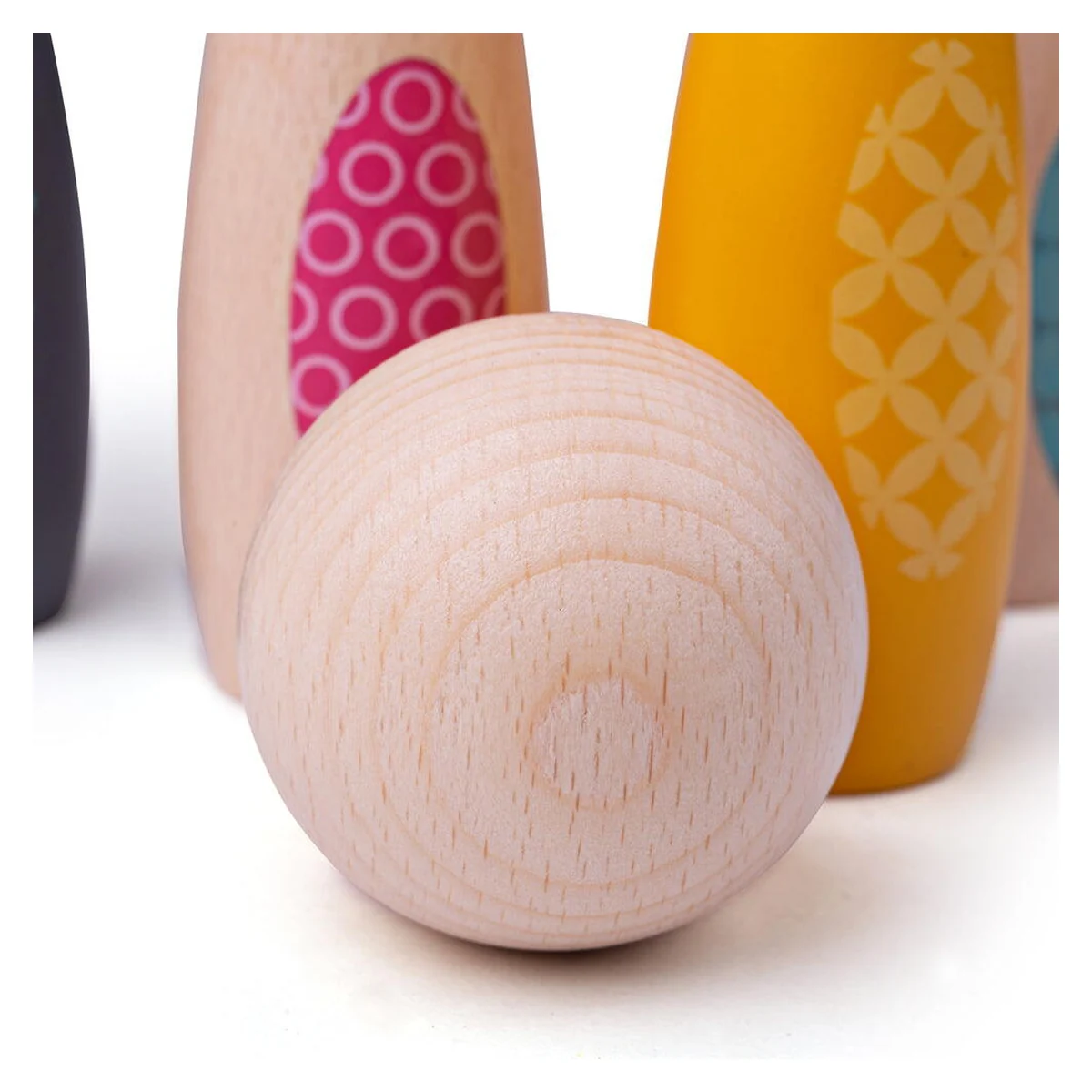 • Setul contine: 6 popice in forma de animale (bufnita, bursuc, cerb, pisica, urs, iepure) si 1 minge de bowling din lemn