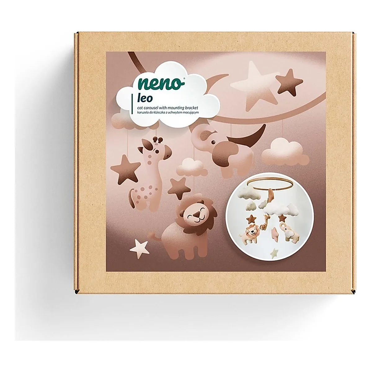 Neno Leo este un carusel adorabil, realizat manual, care îmbină materiale naturale cu un design delicat și minimalist. Animalutele lucrate manual, stelele și luna aduc o atmosferă de pace și căldură în camera copilului tău, leganandu-se ușor deasupra pătuțului si creand o atmosferă calmă și plină de căldură, sprijinind în același timp dezvoltarea timpurie a bebelușului.