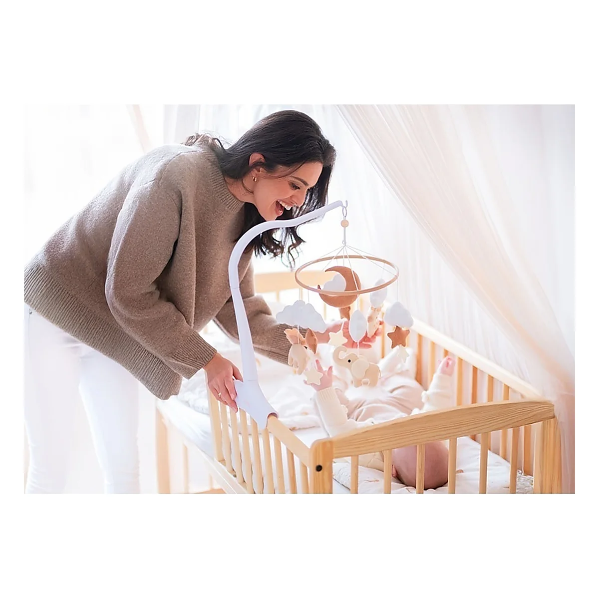 Caruselul se montează rapid, fără unelte suplimentare. Suportul de prindere inclus este robust și bine proiectat, fiind compatibil cu majoritatea pătuțurilor și asigurând o utilizare zilnică sigură.