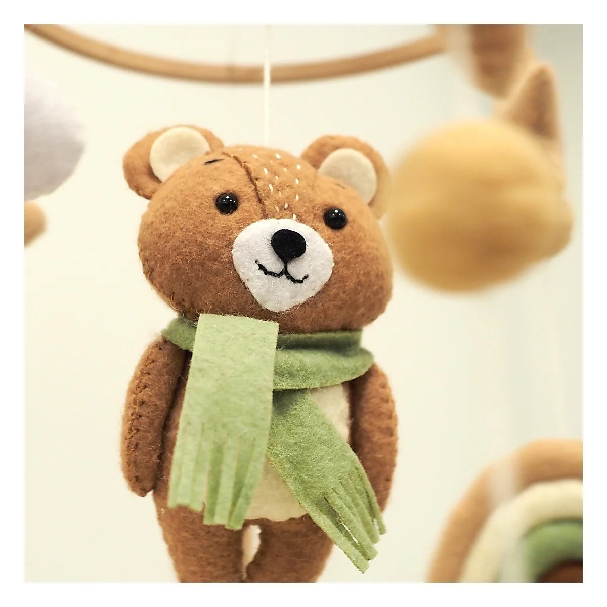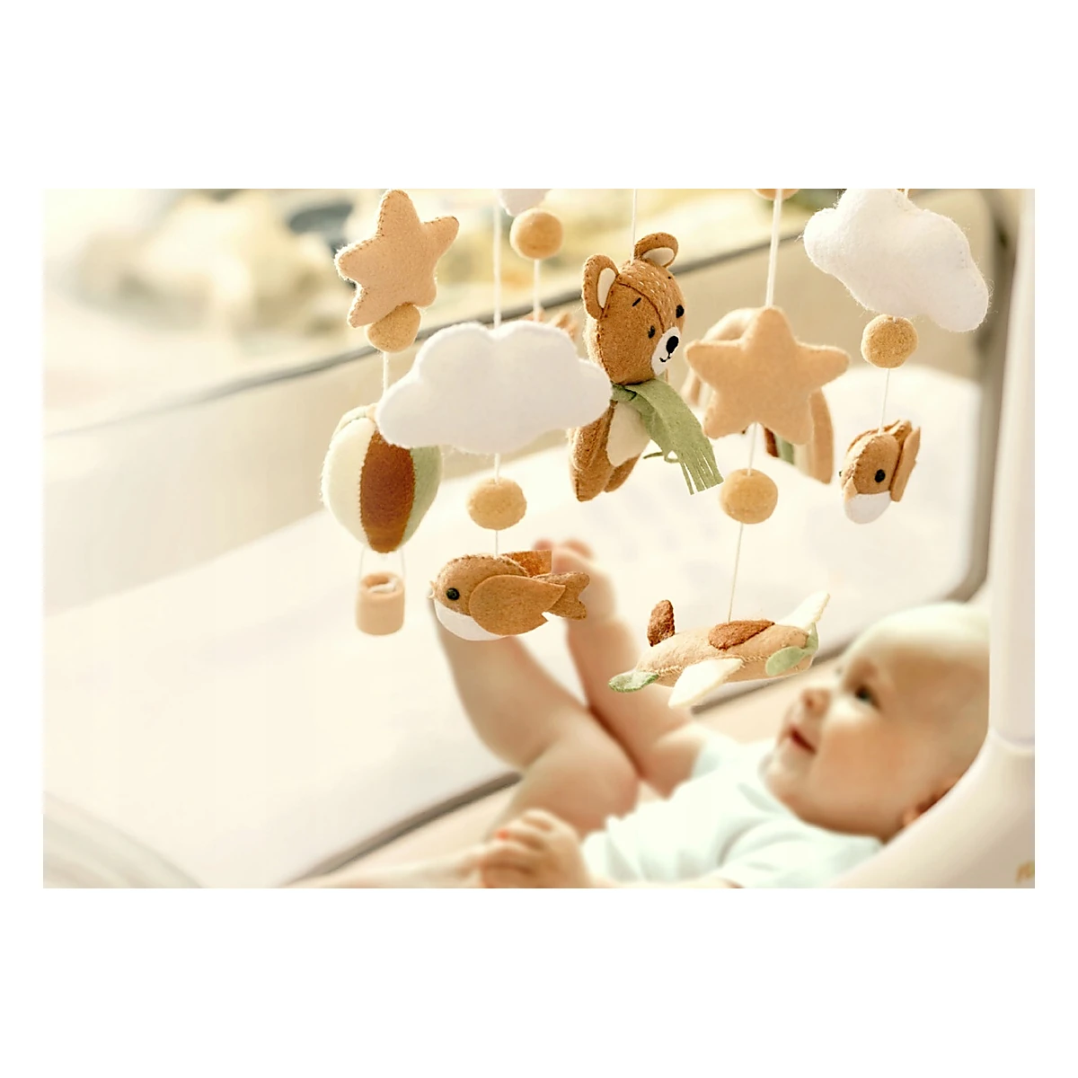 Mascotele în formă de urși, păsări și stele sunt cusute manual din fetru delicat și umplutură moale. Aspectul lor plăcut și mișcarea subtilă de legănare creează o senzație de liniște și siguranță, ideală pentru momentele de relaxare și somn.