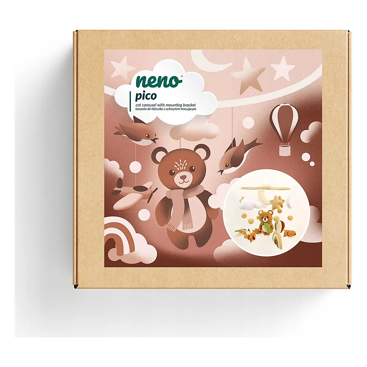 Neno Pico este un carusel adorabil, realizat manual, care îmbină materiale naturale cu un design delicat și minimalist. Urșii, norii și stelele care se leagănă ușor deasupra pătuțului creează o atmosferă calmă și plină de căldură, sprijinind în același timp dezvoltarea timpurie a bebelușului.