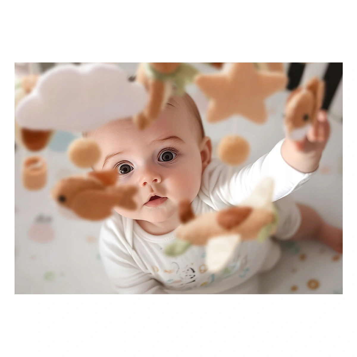 Elementele suspendate se mișcă ușor, atrăgând atenția bebelușului și ajutându-l să își dezvolte capacitatea de a urmări mișcarea, de a distinge formele și culorile încă din primele luni de viață.