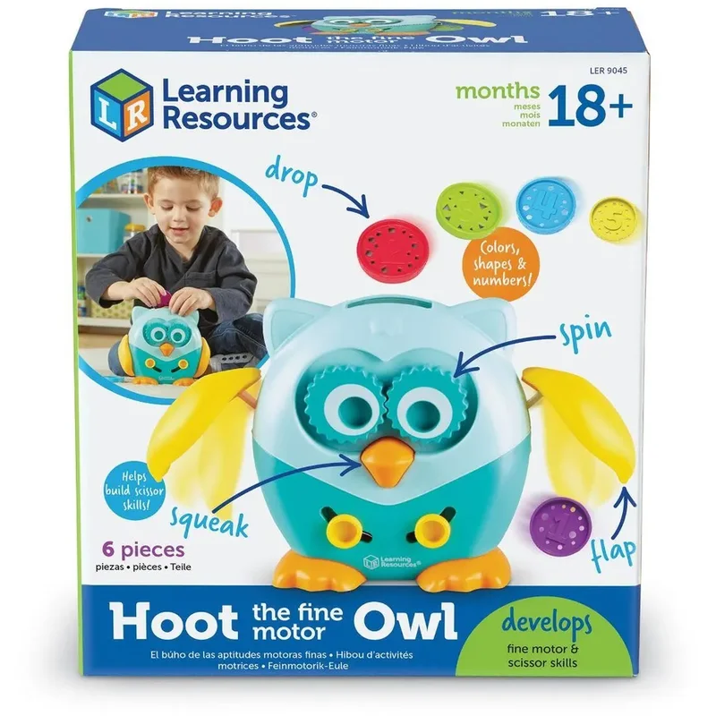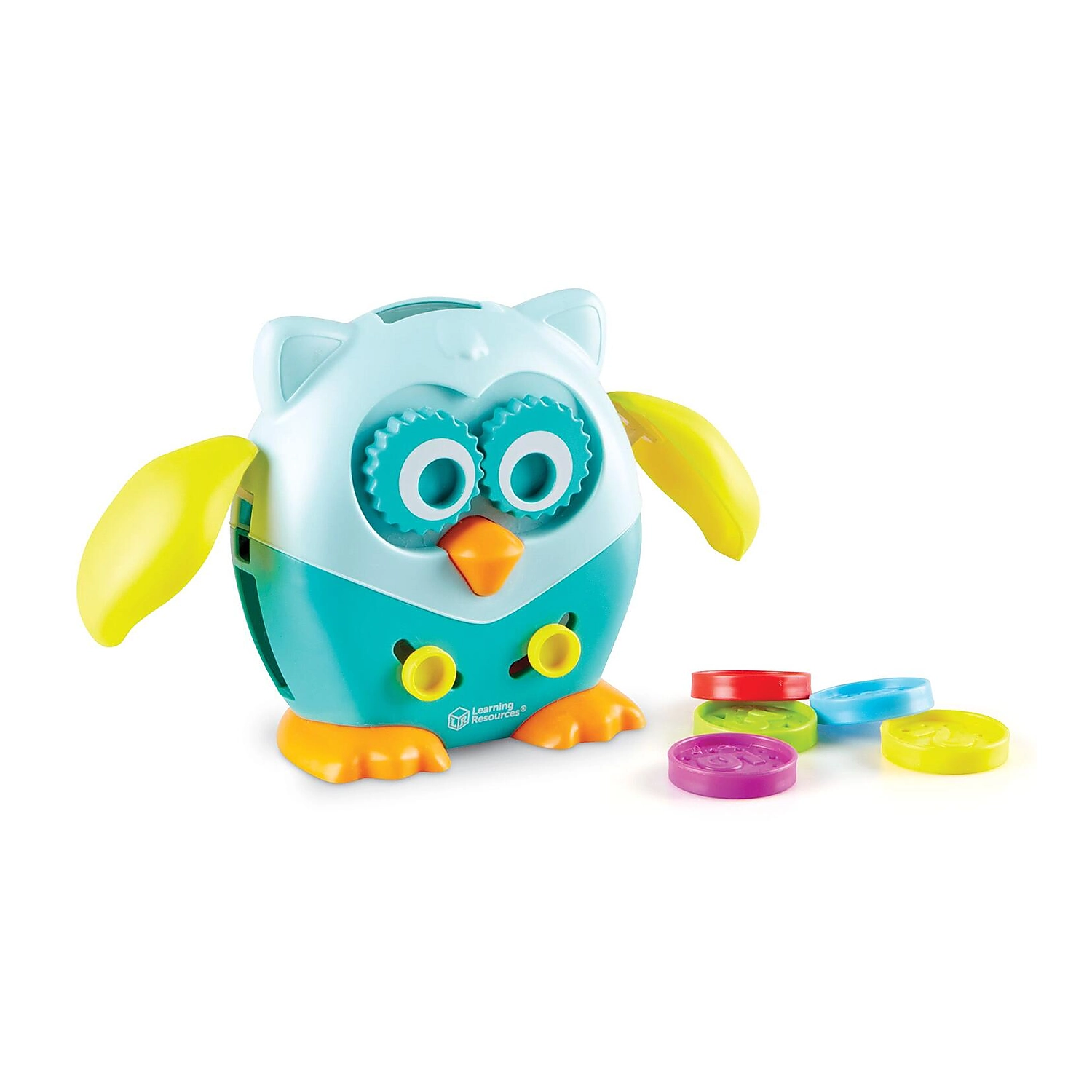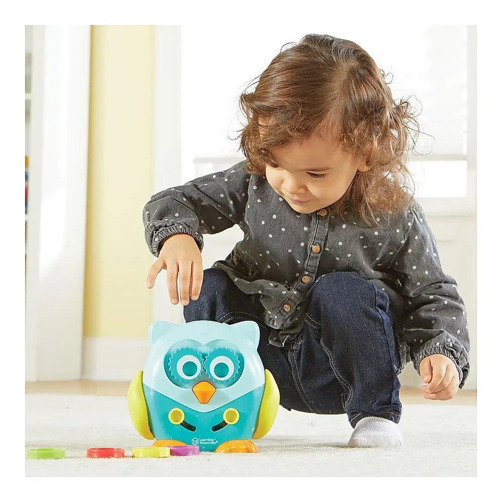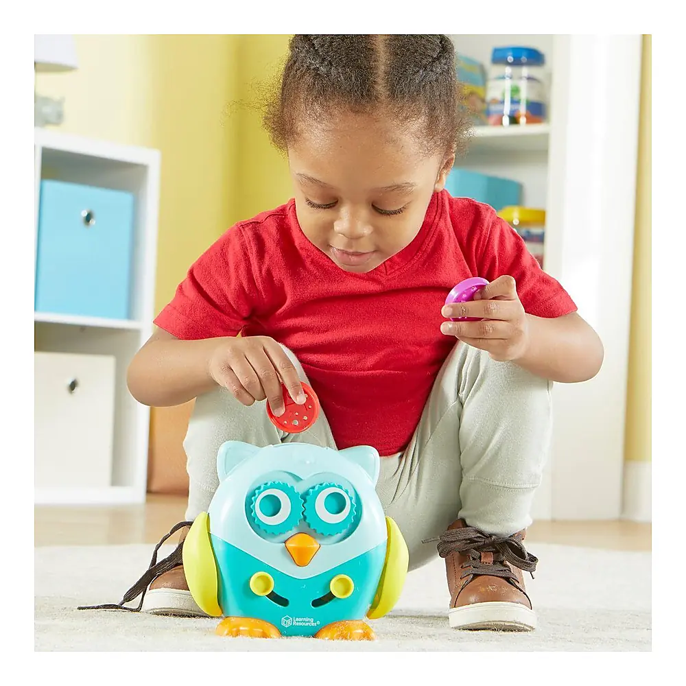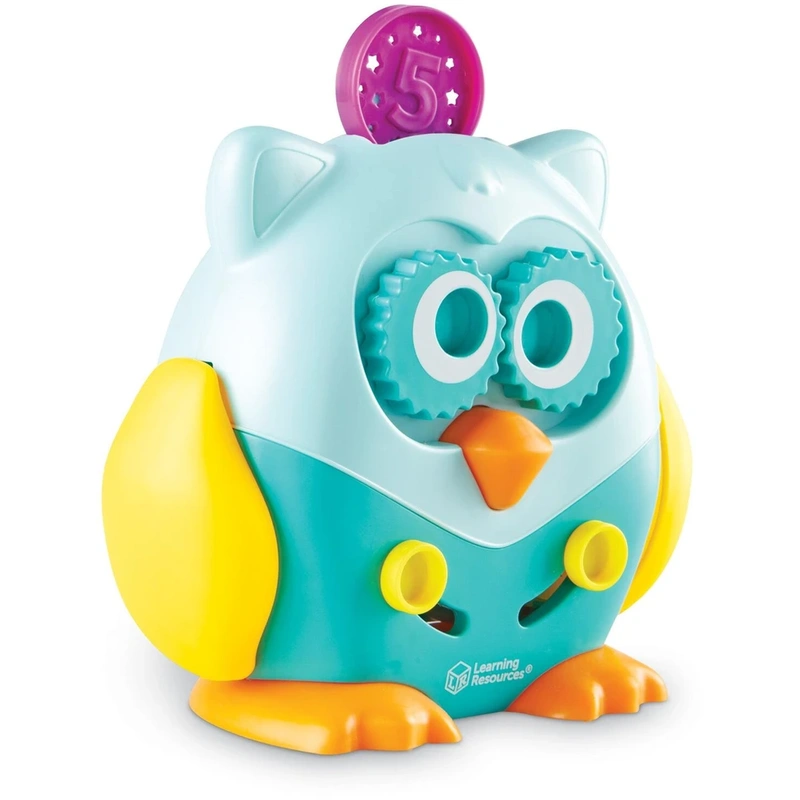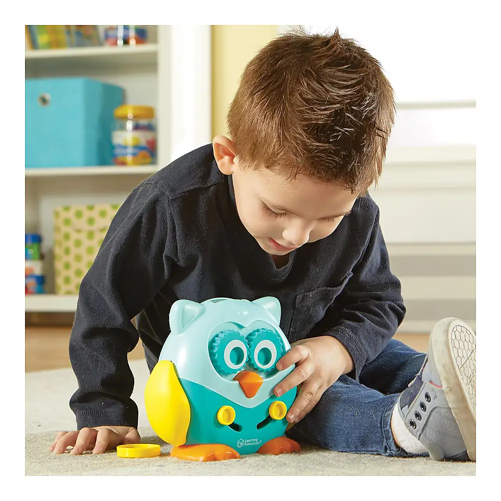 - copiii exerseaza prinderea prin rotirea ochilor bufnitei, isi construiesc forta in manute prin apasarea nasului si isi dezvolta coordonarea ochi-mana prin inserarea monedelor prin orificiul aflat pe capul bufnitei