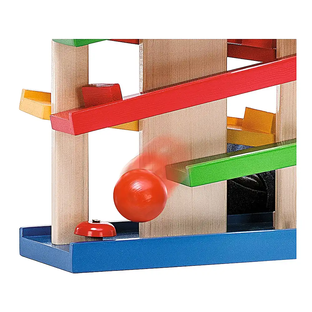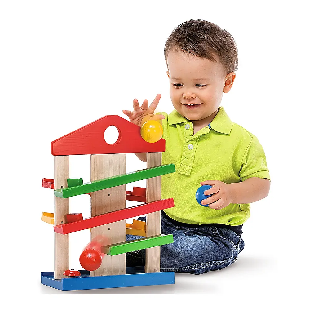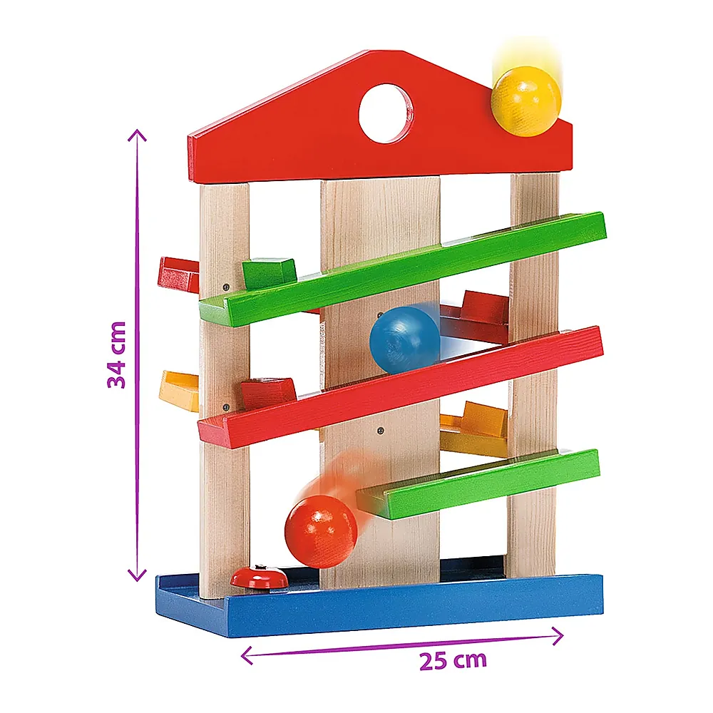 - Bilele se pozitioneaza in partea de sus si se rostogolesc pana jos, urmand traseul. Astfel, micutii vor fi atrasi de aceasta jucarie cu bile, modalitatea in care bila va ajunge de pe o pista pe alta le va capta atentia