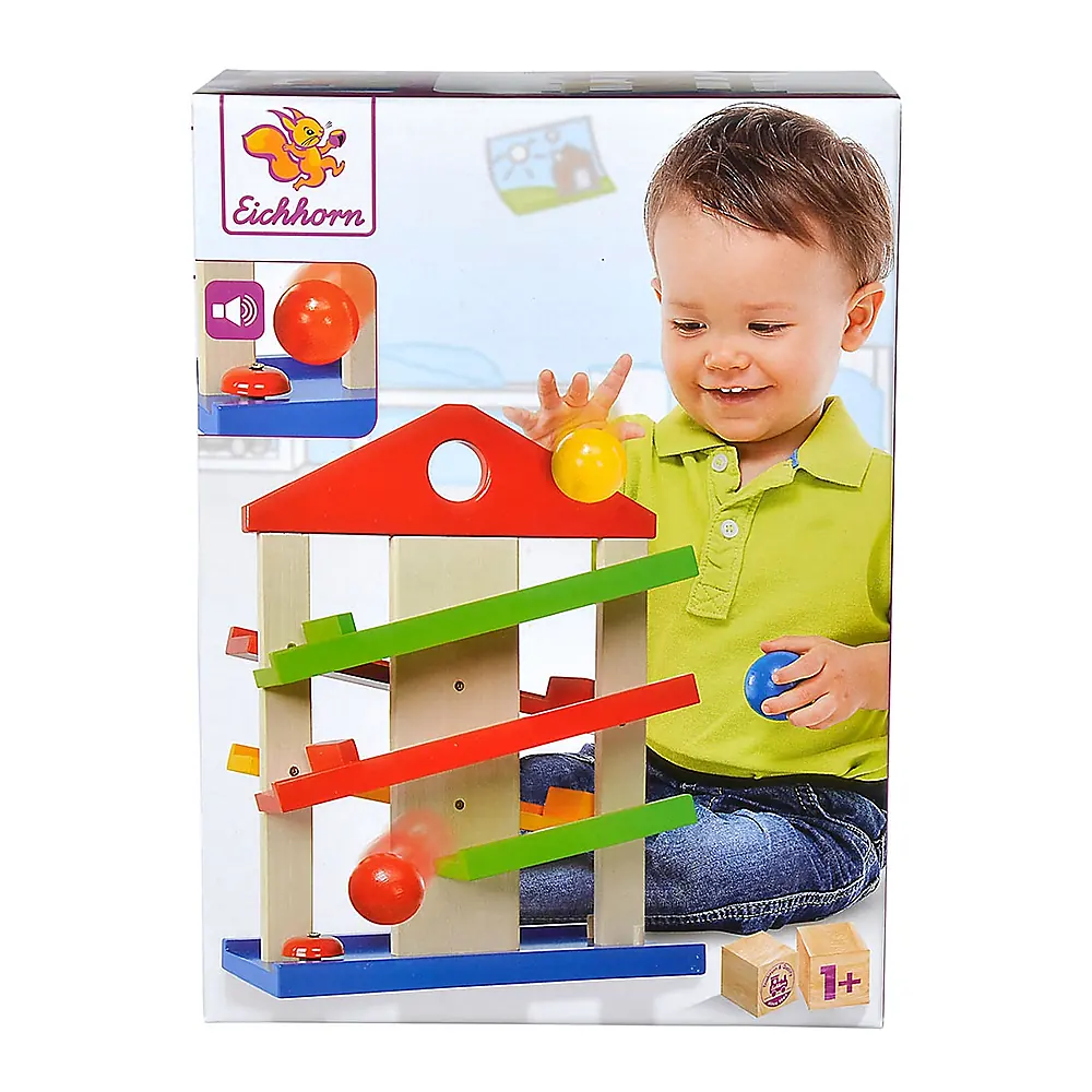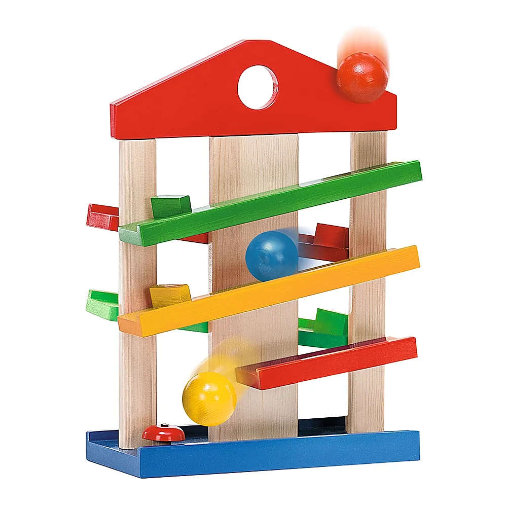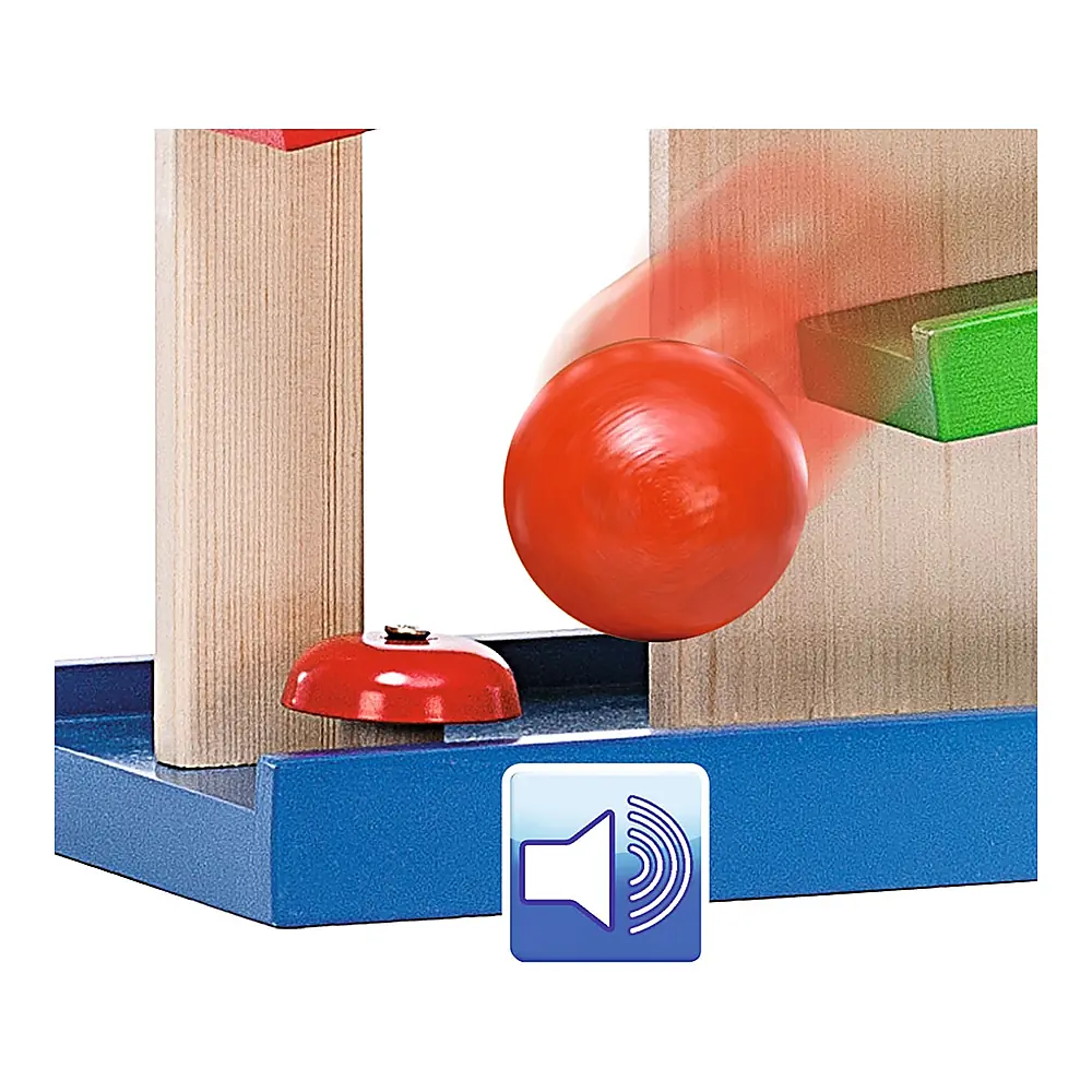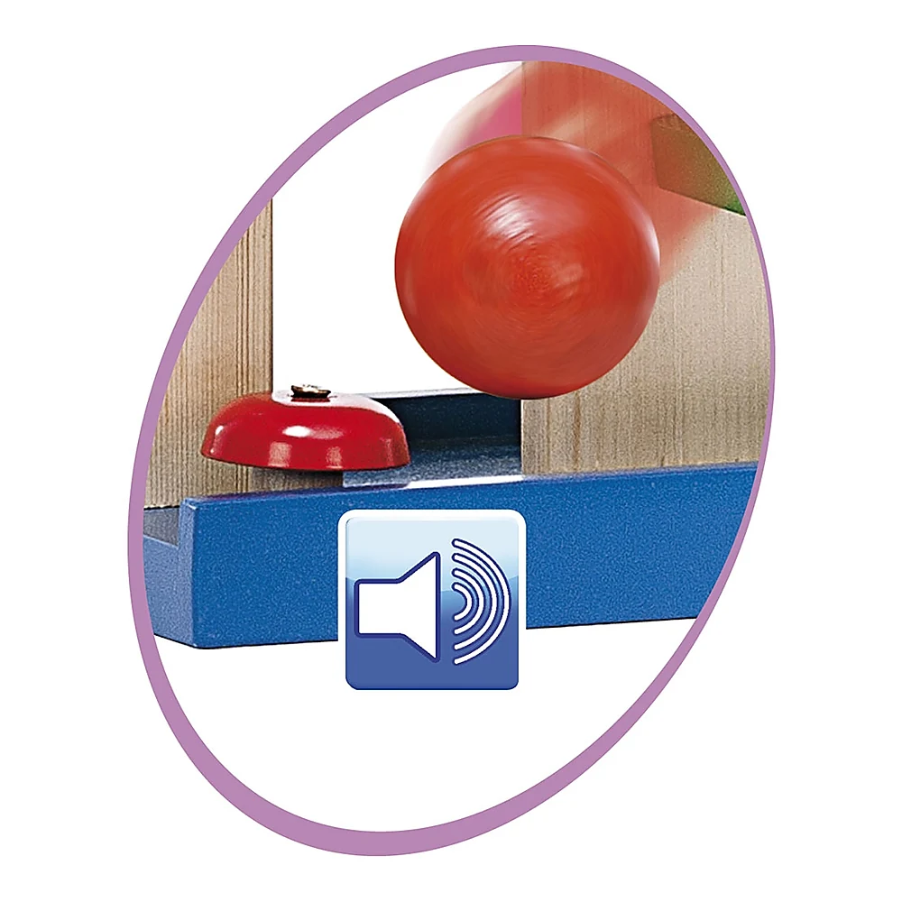 - Bilele se pozitioneaza in partea de sus si se rostogolesc pana jos, urmand traseul. Astfel, micutii vor fi atrasi de aceasta jucarie cu bile, modalitatea in care bila va ajunge de pe o pista pe alta le va capta atentia