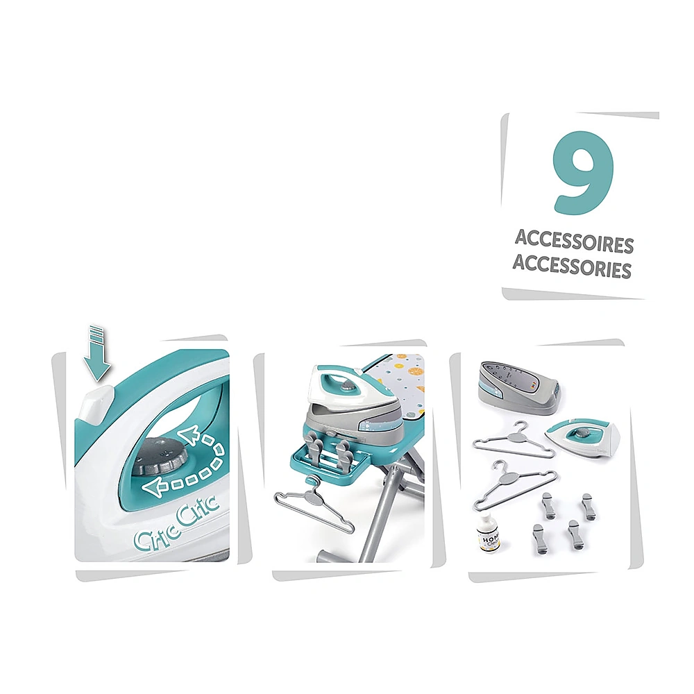 - Setul de calcat Smoby contine 9 accesorii: calcator, 2 umerase, 5 cleme si un pulverizator de apa