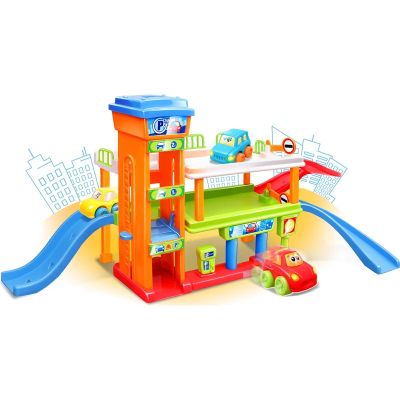 Setul include 33 piese: 3 masinute, rampe, parcari supraetajate, benzinarie, spalatorie auto etc.