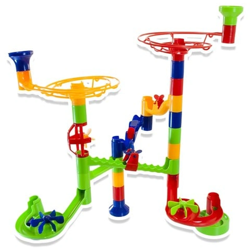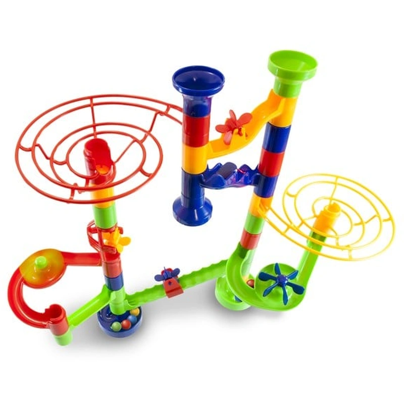 Joc de constructii cu piese de forme si culori variate, util pentru dezvoltarea abilitatilor de coordonare ochi-mana, a miscarilor fine si a perceperii relatiilor spatiale, dar si o cursa distractiva cu bile.